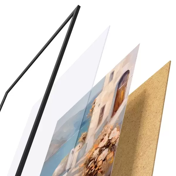 De poster bestaat uit een frame, plexiglas, geprinte afbeelding en spaanplaat achterkant. De poster kan meteen aan de muur worden gehangen dankzij de bevestigingen op de achterkant.