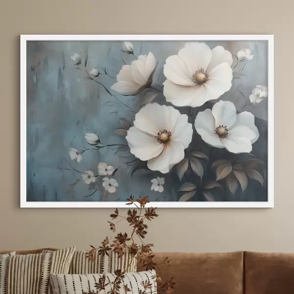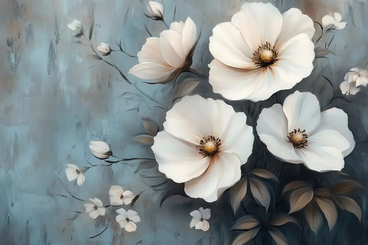 Poster Witte bloemen op een blauwe achtergrond Nr f42319