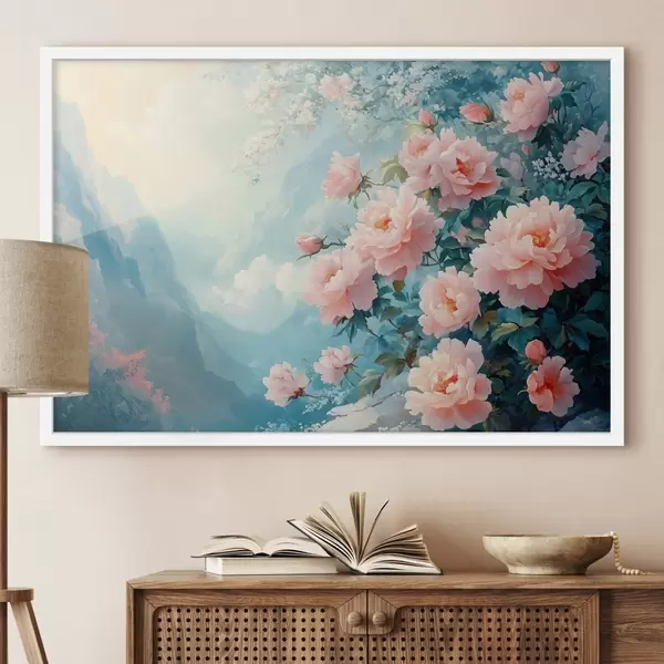 Poster Blauwe bergen en bloemen op de voorgrond Nr f42324