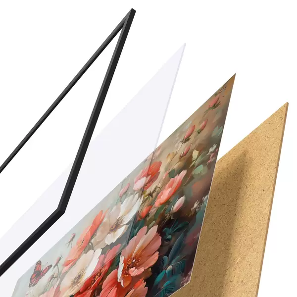De poster bestaat uit een frame, plexiglas, geprinte afbeelding en spaanplaat achterkant. De poster kan meteen aan de muur worden gehangen dankzij de bevestigingen op de achterkant.