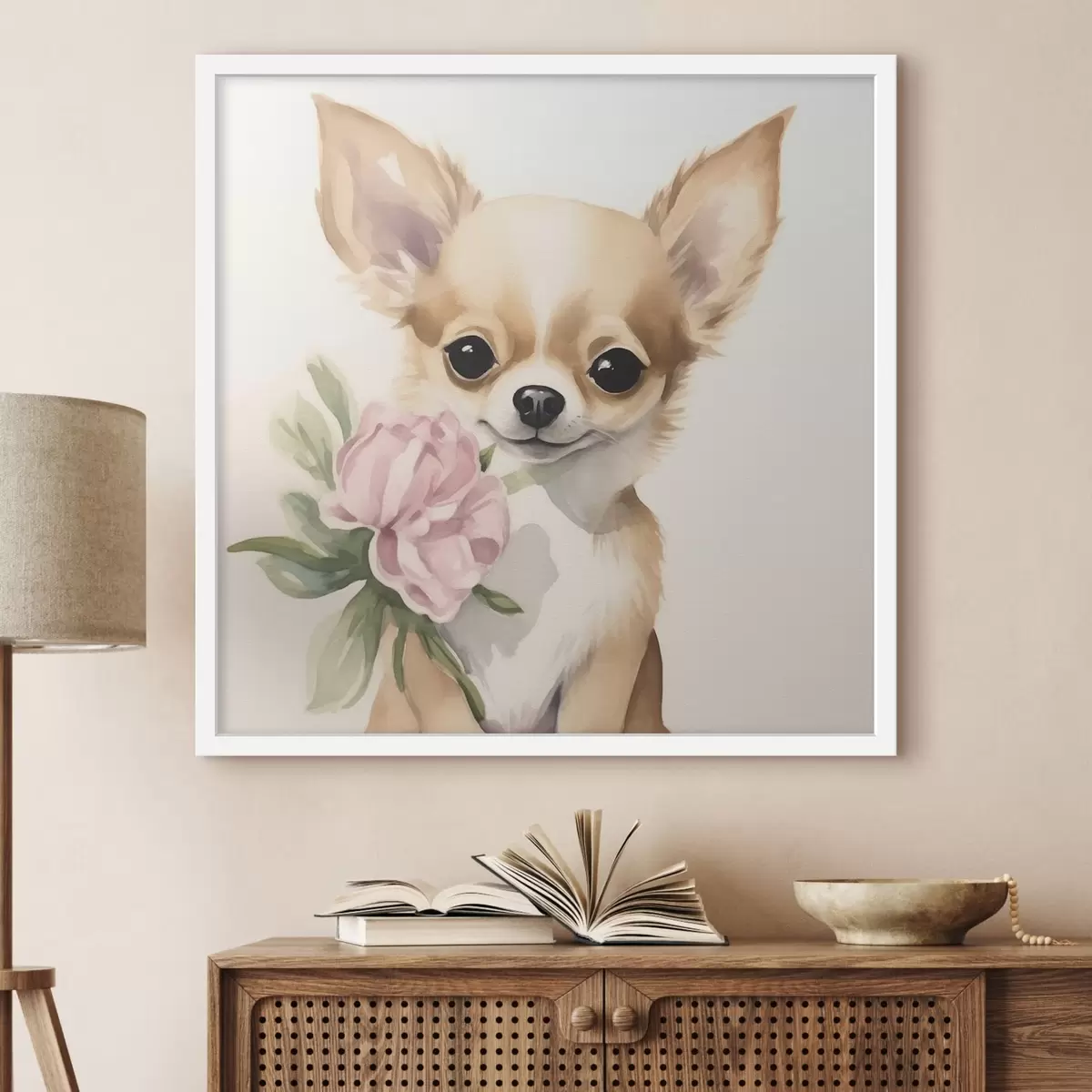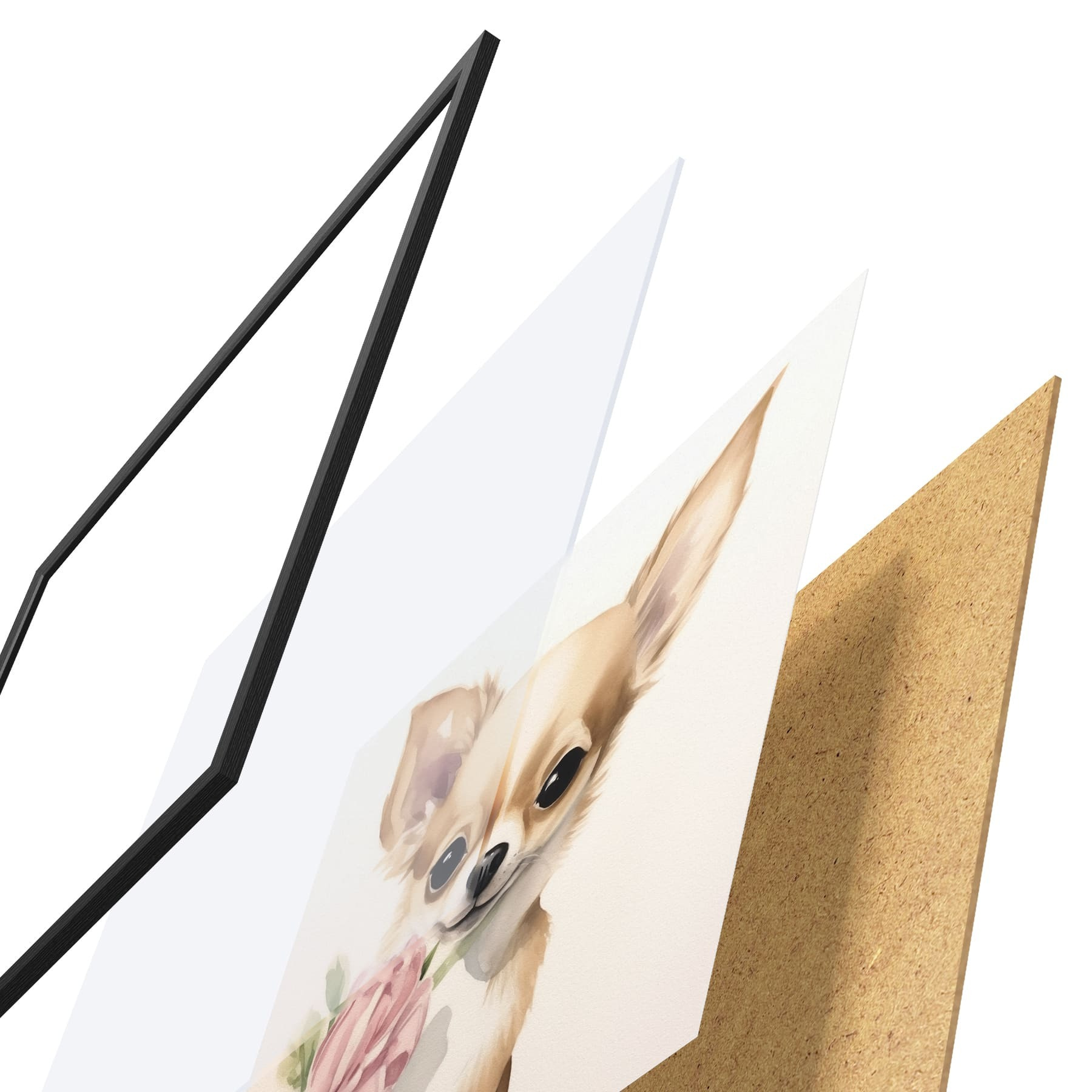 De poster bestaat uit een frame, plexiglas, geprinte afbeelding en spaanplaat achterkant. De poster kan meteen aan de muur worden gehangen dankzij de bevestigingen op de achterkant.