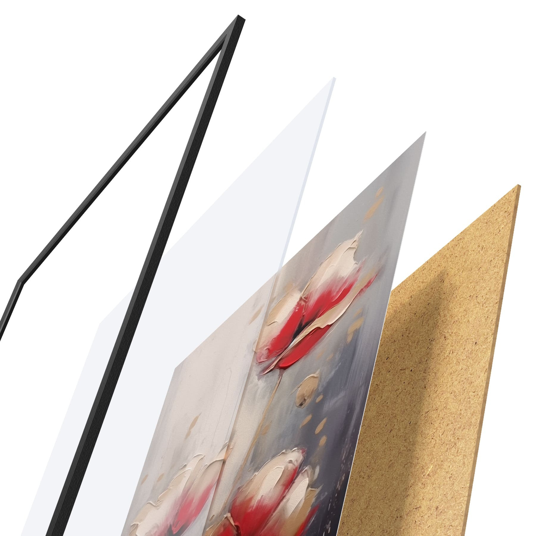 De poster bestaat uit een frame, plexiglas, geprinte afbeelding en spaanplaat achterkant. De poster kan meteen aan de muur worden gehangen dankzij de bevestigingen op de achterkant.