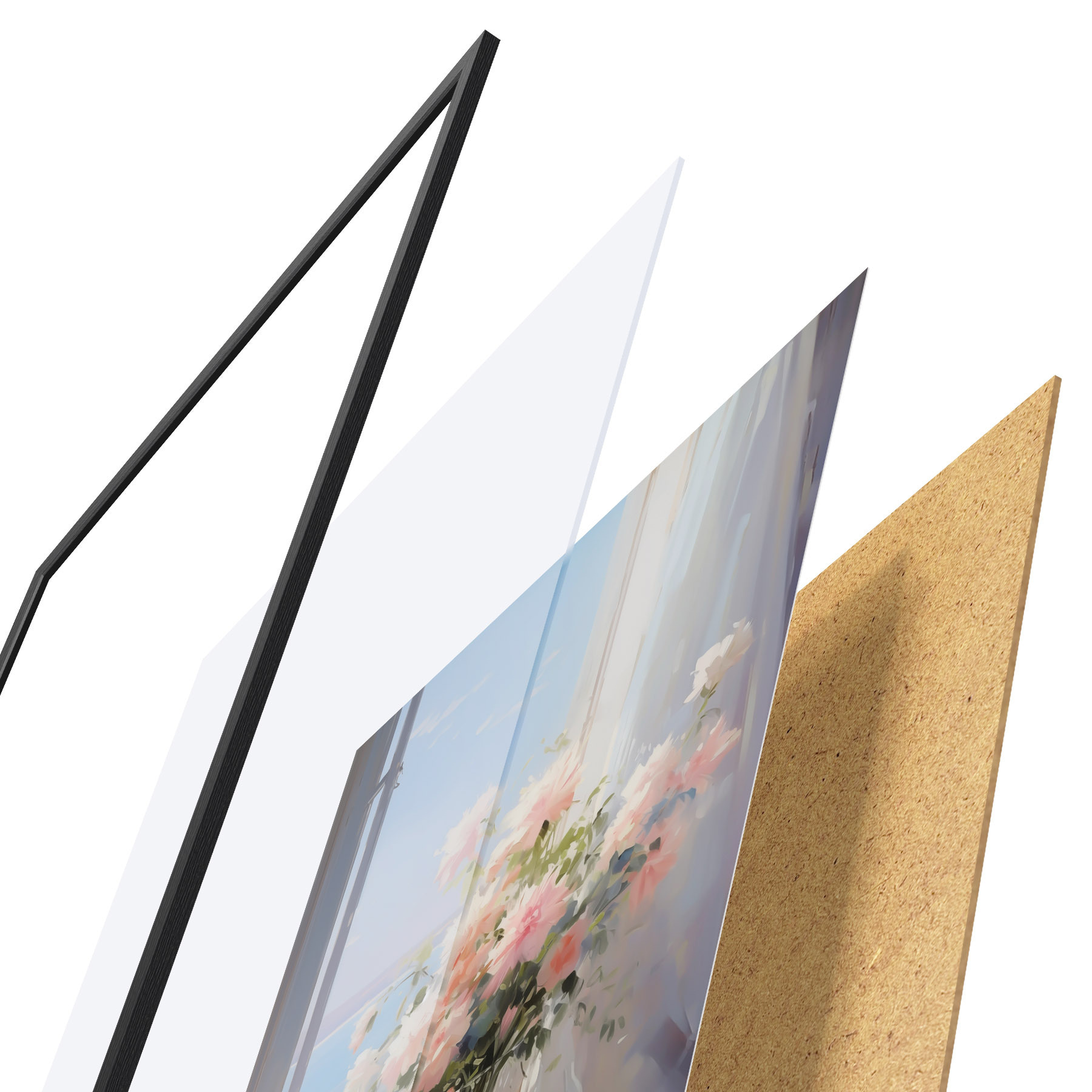 De poster bestaat uit een frame, plexiglas, geprinte afbeelding en spaanplaat achterkant. De poster kan meteen aan de muur worden gehangen dankzij de bevestigingen op de achterkant.