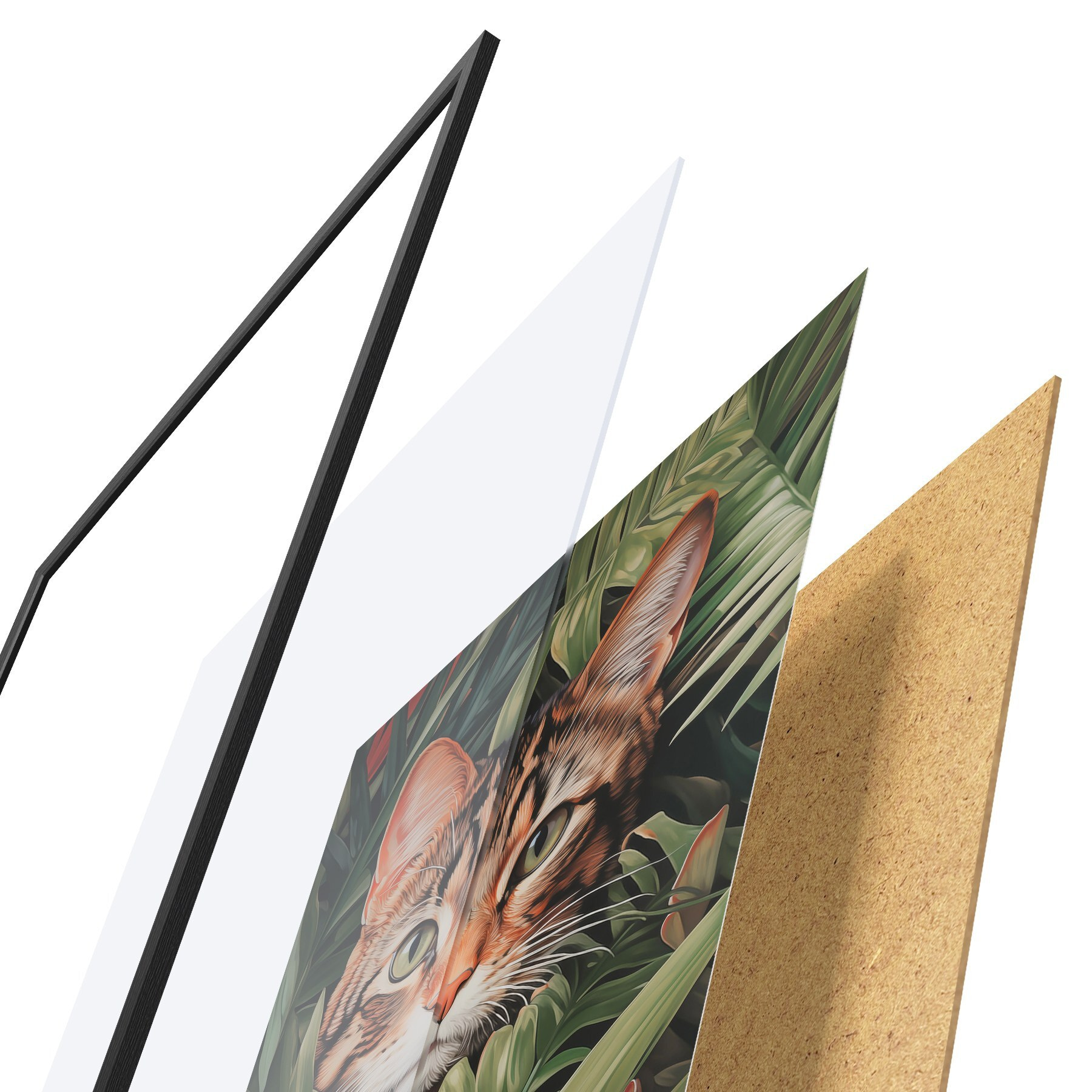 De poster bestaat uit een frame, plexiglas, geprinte afbeelding en spaanplaat achterkant. De poster kan meteen aan de muur worden gehangen dankzij de bevestigingen op de achterkant.
