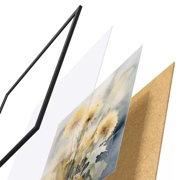 De poster bestaat uit een frame, plexiglas, geprinte afbeelding en spaanplaat achterkant. De poster kan meteen aan de muur worden gehangen dankzij de bevestigingen op de achterkant.
