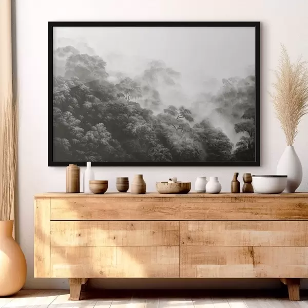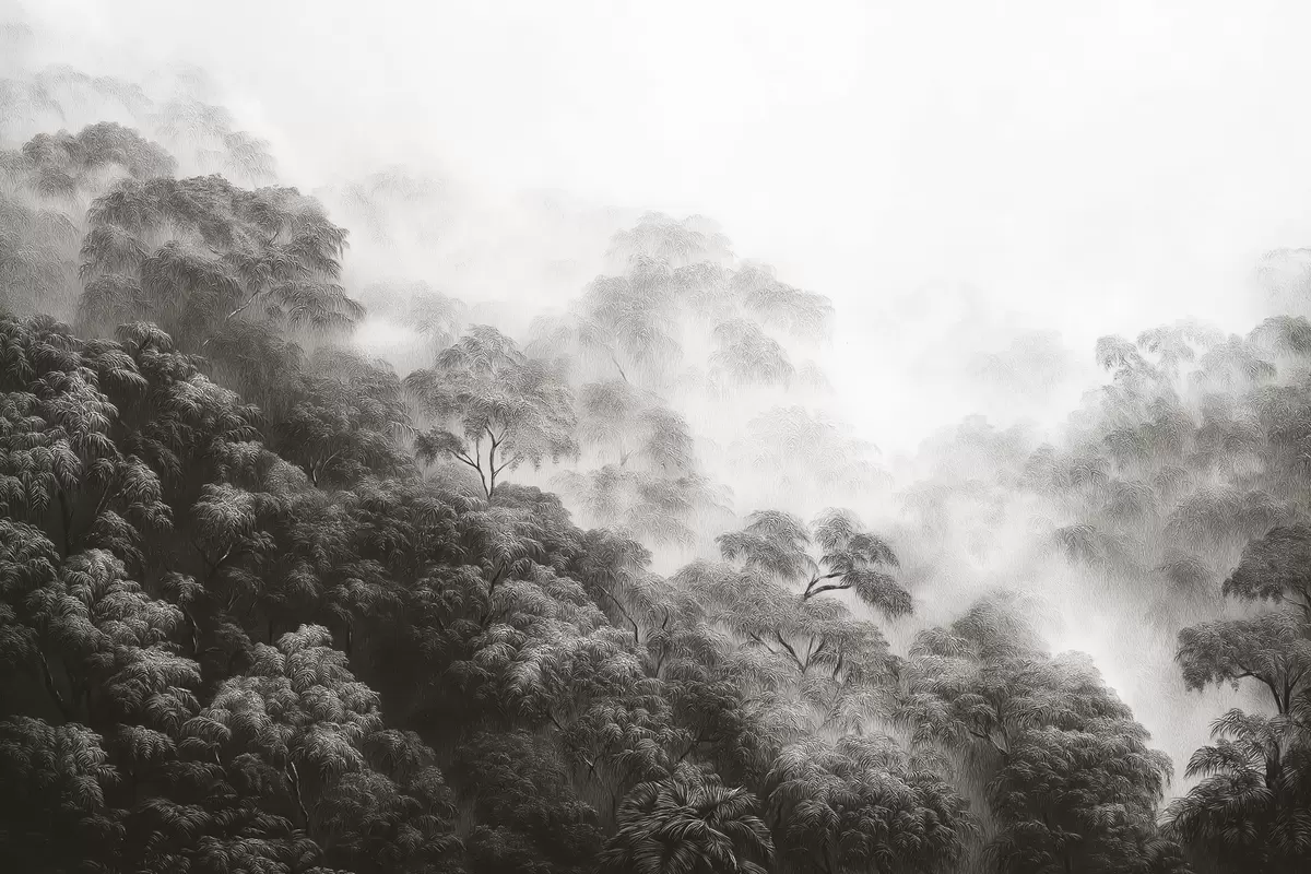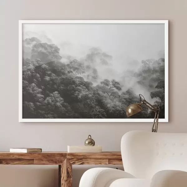 Poster Tropisch bos in de mist, palmbomen, grijze kleuren Nr f42371v1