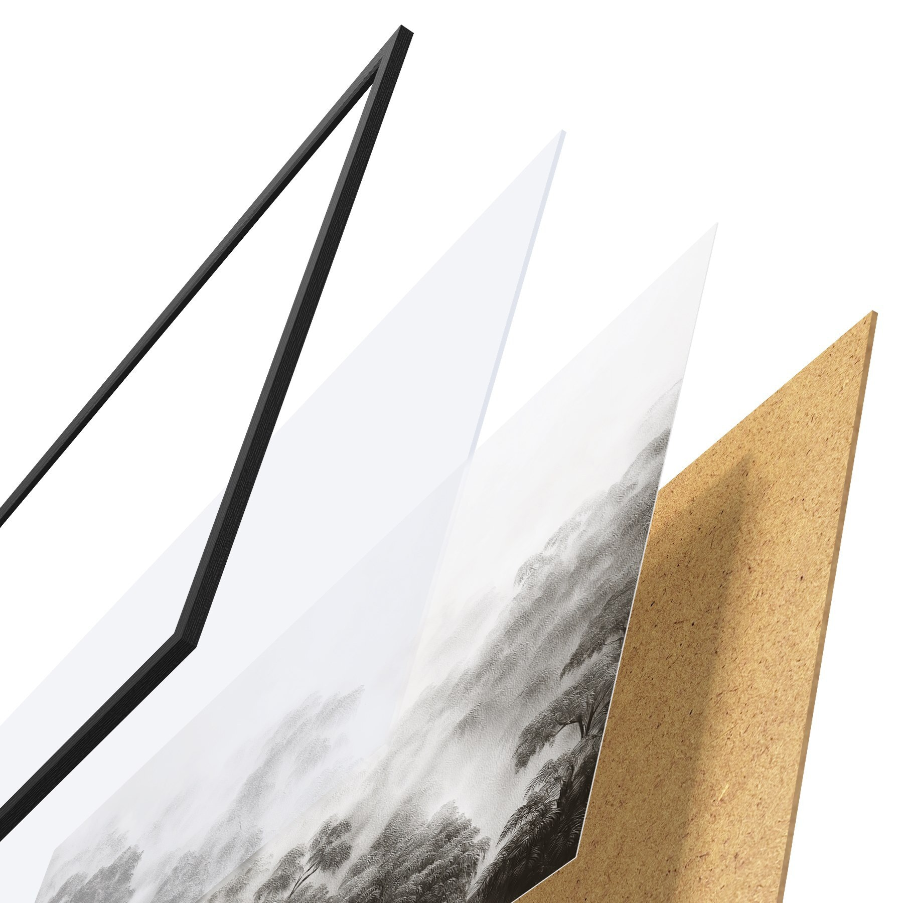 De poster bestaat uit een frame, plexiglas, geprinte afbeelding en spaanplaat achterkant. De poster kan meteen aan de muur worden gehangen dankzij de bevestigingen op de achterkant.