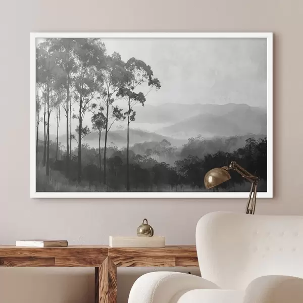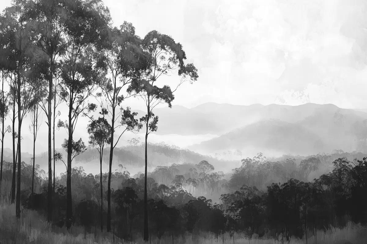 Poster Mystiek bos in grijstinten, natuurlandschap, bomen Nr f42373