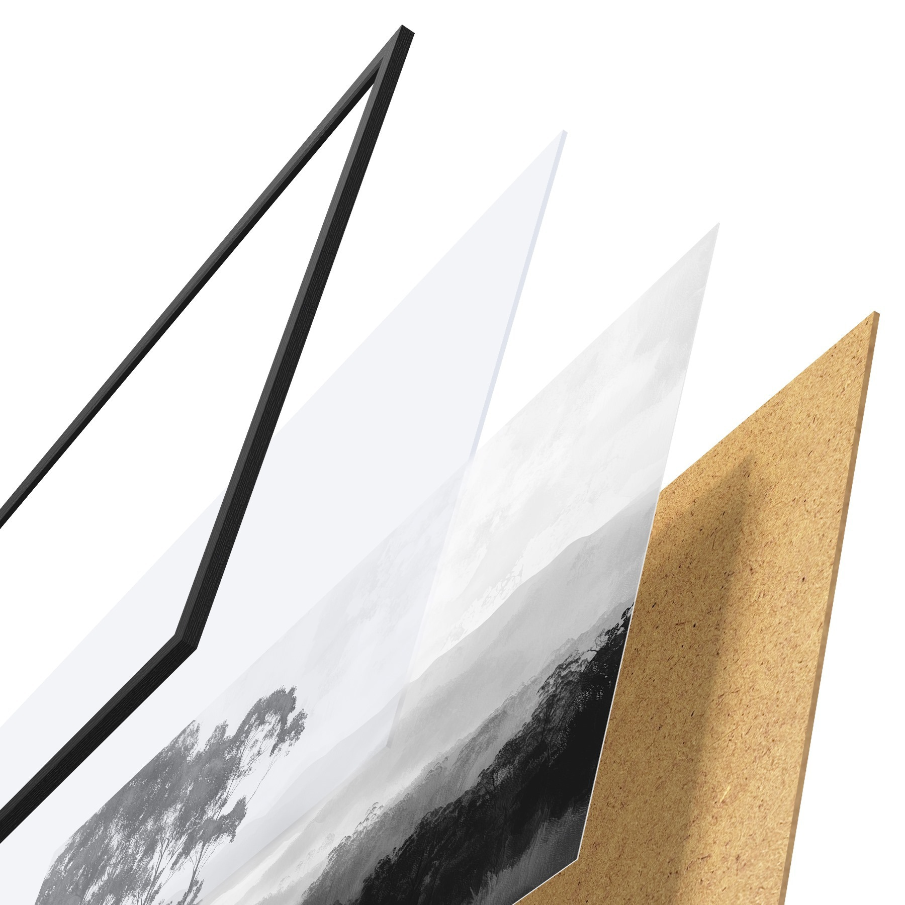 De poster bestaat uit een frame, plexiglas, geprinte afbeelding en spaanplaat achterkant. De poster kan meteen aan de muur worden gehangen dankzij de bevestigingen op de achterkant.