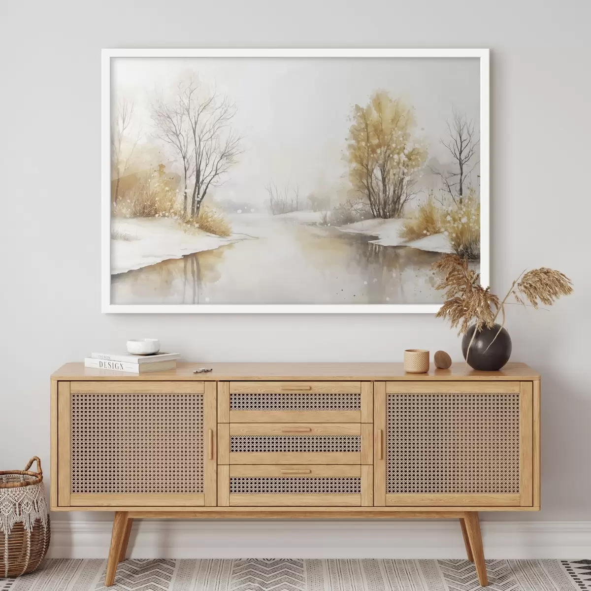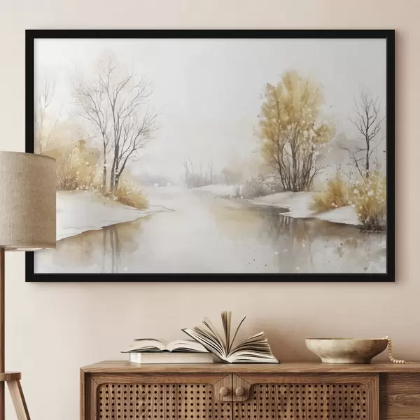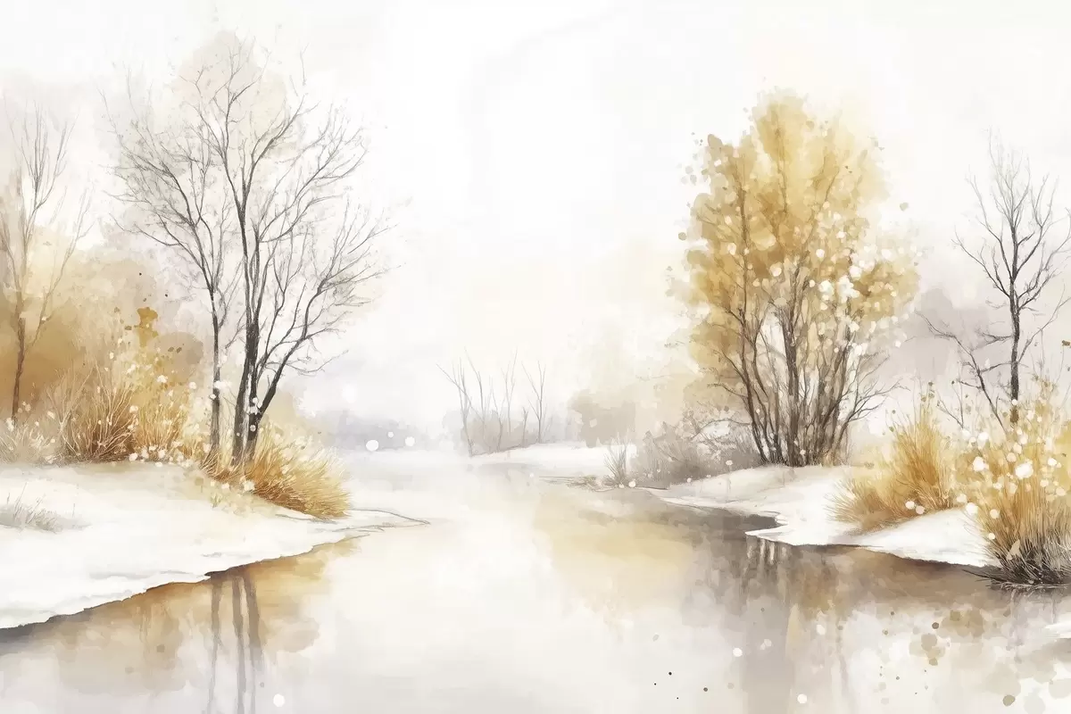 Poster Winterlandschap, rivier en bomen, aquarel stijl, beige kleuren Nr f42376