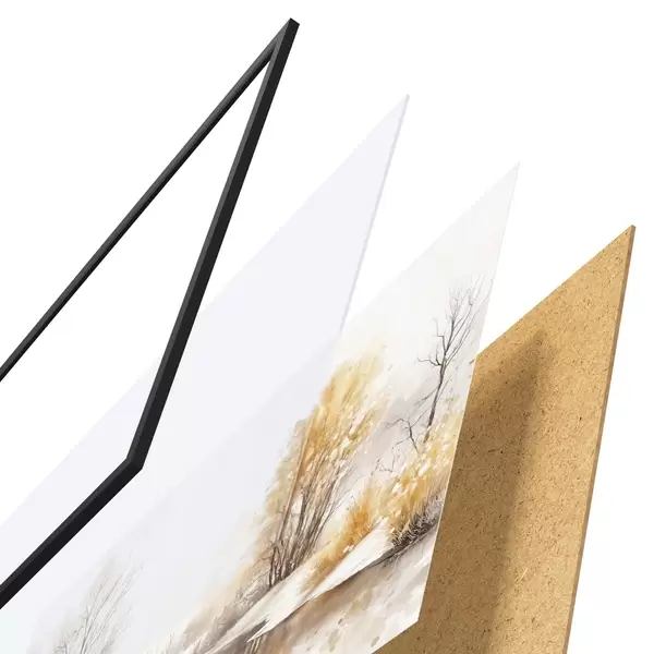 De poster bestaat uit een frame, plexiglas, geprinte afbeelding en spaanplaat achterkant. De poster kan meteen aan de muur worden gehangen dankzij de bevestigingen op de achterkant.
