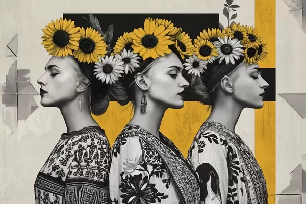 Poster Mooie vrouwen in etnische kleding met zonnebloemsleutels Nr f42378