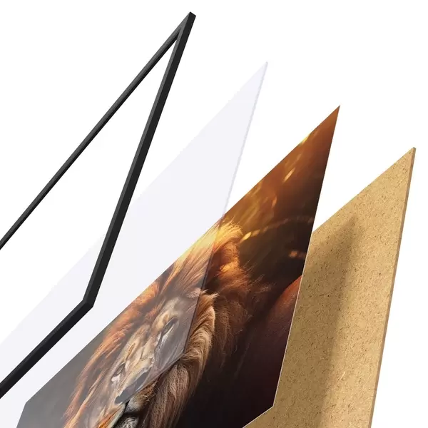 De poster bestaat uit een frame, plexiglas, geprinte afbeelding en spaanplaat achterkant. De poster kan meteen aan de muur worden gehangen dankzij de bevestigingen op de achterkant.