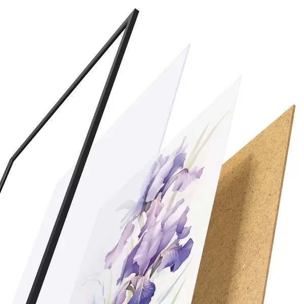 De poster bestaat uit een frame, plexiglas, geprinte afbeelding en spaanplaat achterkant. De poster kan meteen aan de muur worden gehangen dankzij de bevestigingen op de achterkant.