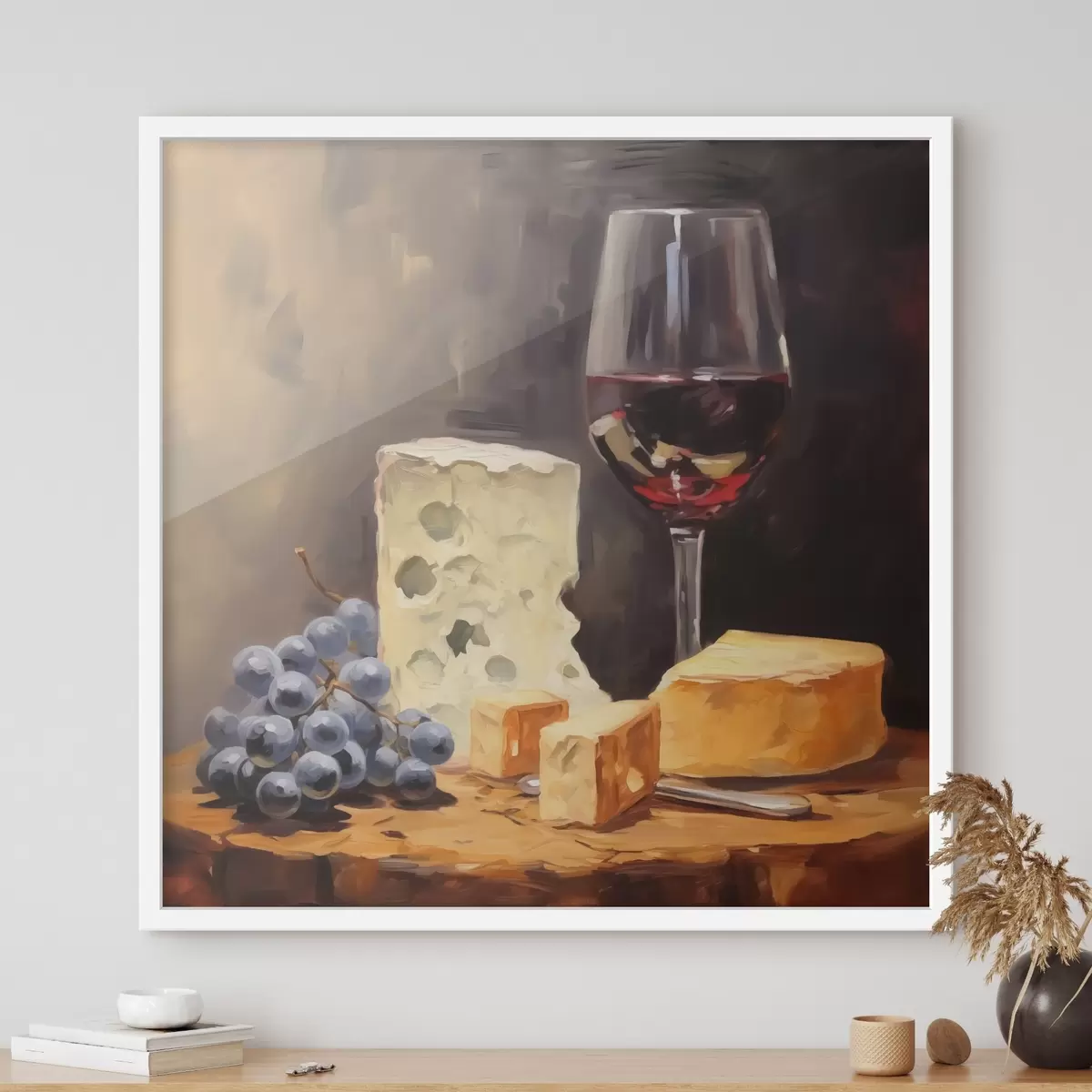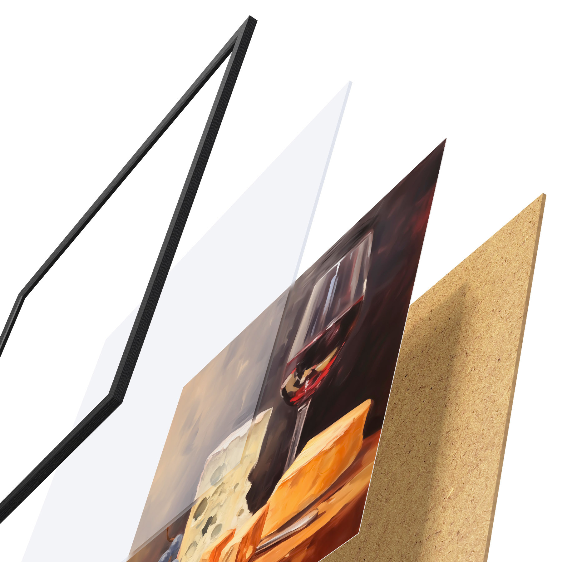 Poster Glas rode wijn en kaas imitatieschilderij f42415