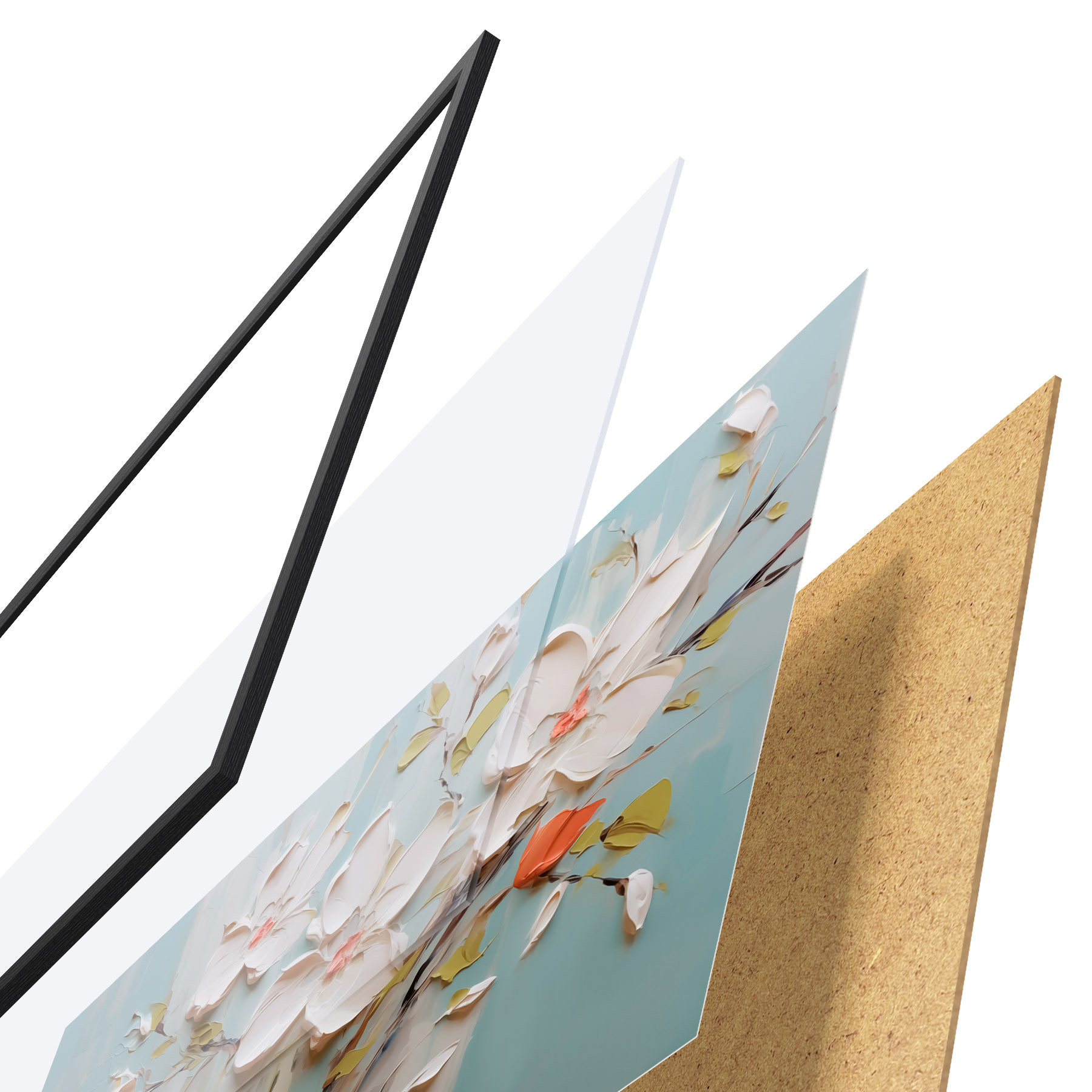 De poster bestaat uit een frame, plexiglas, geprinte afbeelding en spaanplaat achterkant. De poster kan meteen aan de muur worden gehangen dankzij de bevestigingen op de achterkant.