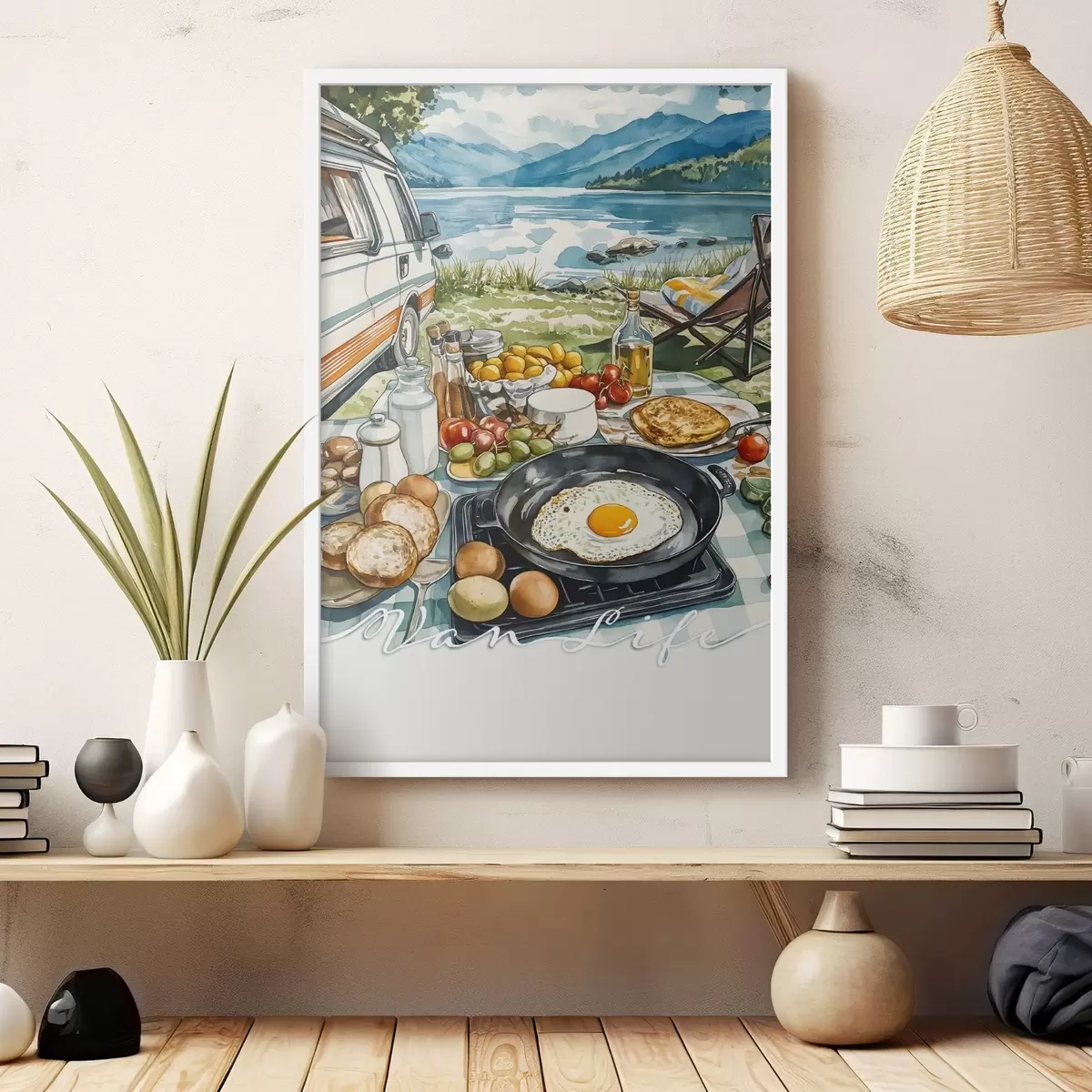 Poster Prachtig ontbijt in aquarelstijl, busleven, kamperen, bergen Nr f42429