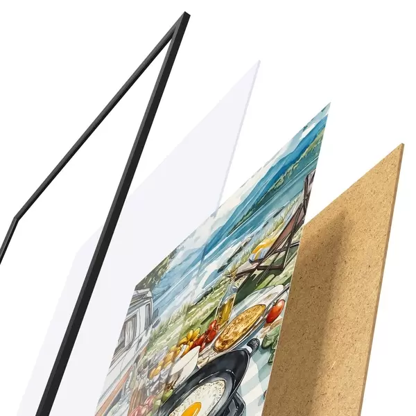 De poster bestaat uit een frame, plexiglas, geprinte afbeelding en spaanplaat achterkant. De poster kan meteen aan de muur worden gehangen dankzij de bevestigingen op de achterkant.