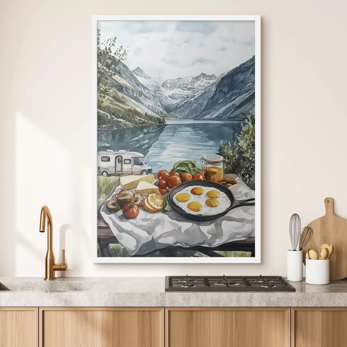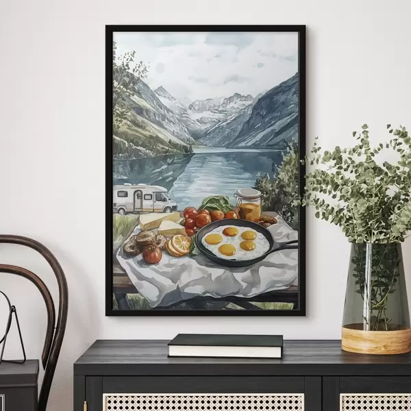 Poster Reizen, natuurlandschappen, aquarelstijl, Noorwegen, ontbijt, bestelwagen Nr f42431