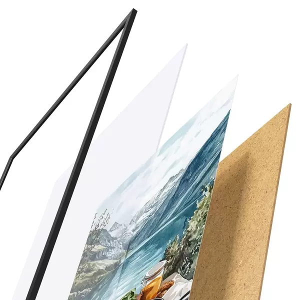 De poster bestaat uit een frame, plexiglas, geprinte afbeelding en spaanplaat achterkant. De poster kan meteen aan de muur worden gehangen dankzij de bevestigingen op de achterkant.