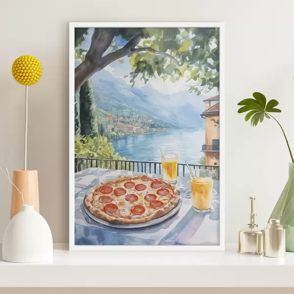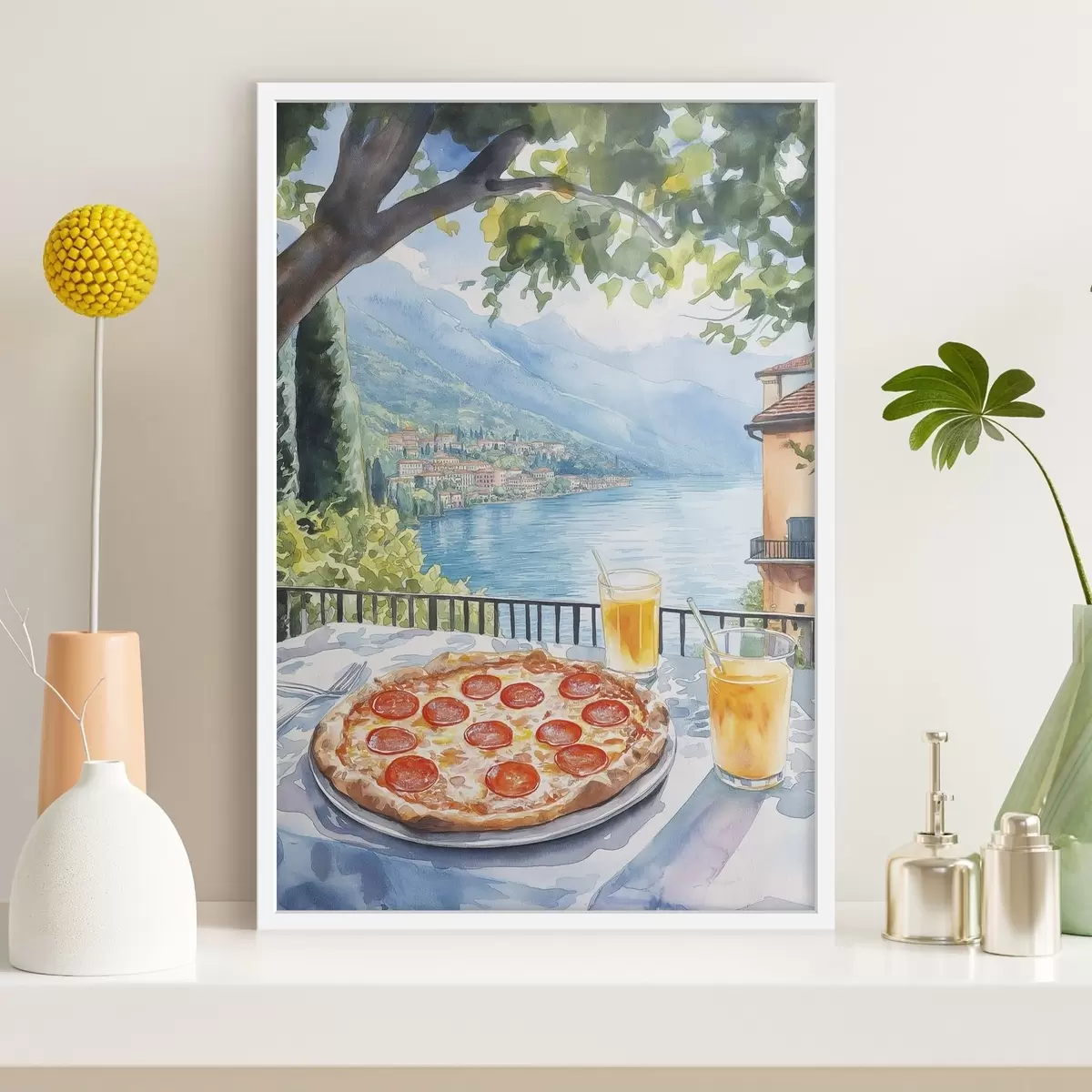 Poster Brunch in Italië, aquarelstijl, pizza margarita, meer, zomernatuur Nr f42436
