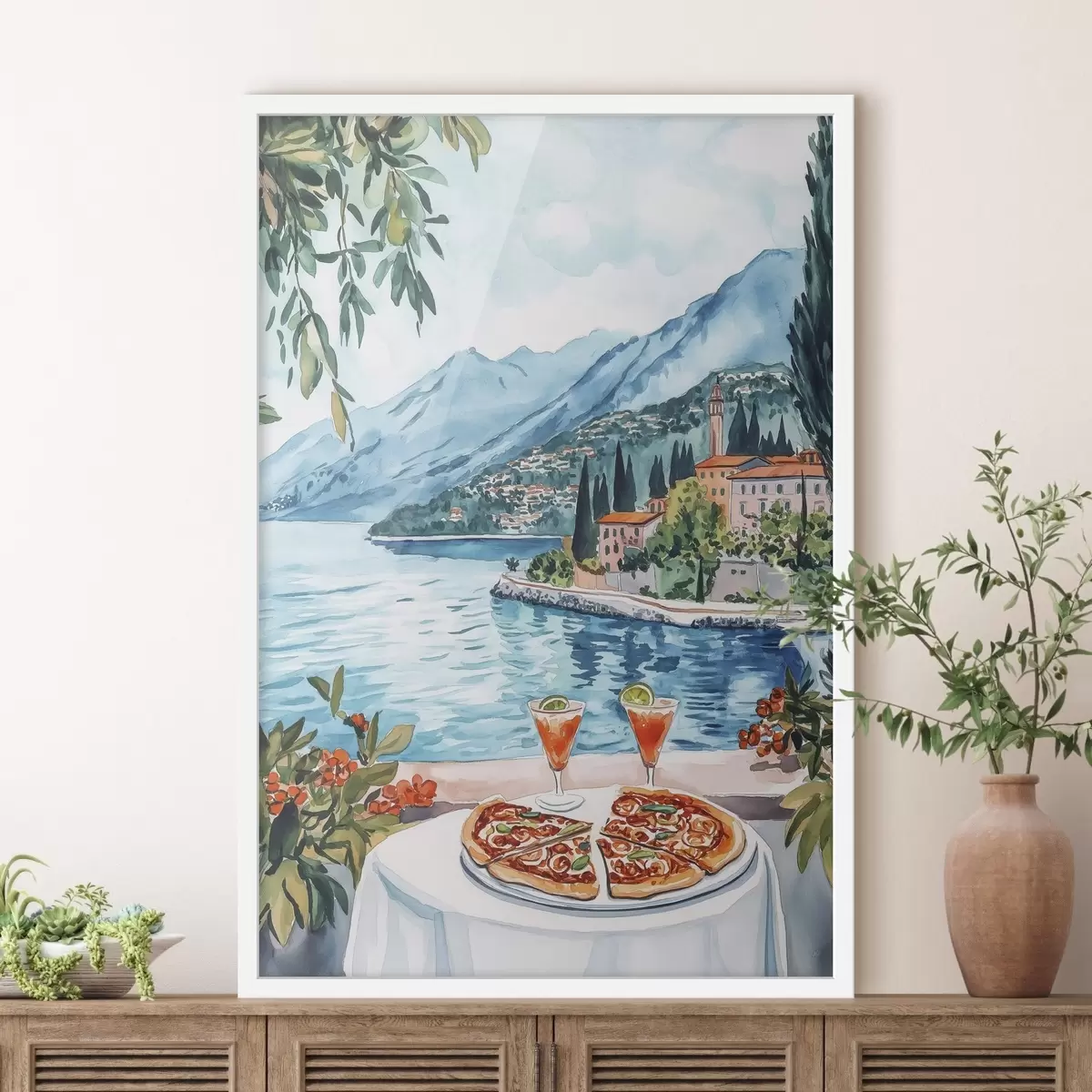 Poster Comomeer, Italië, aquarelstijl, pizza, cocktails, oude stad, bergen Nr f42437