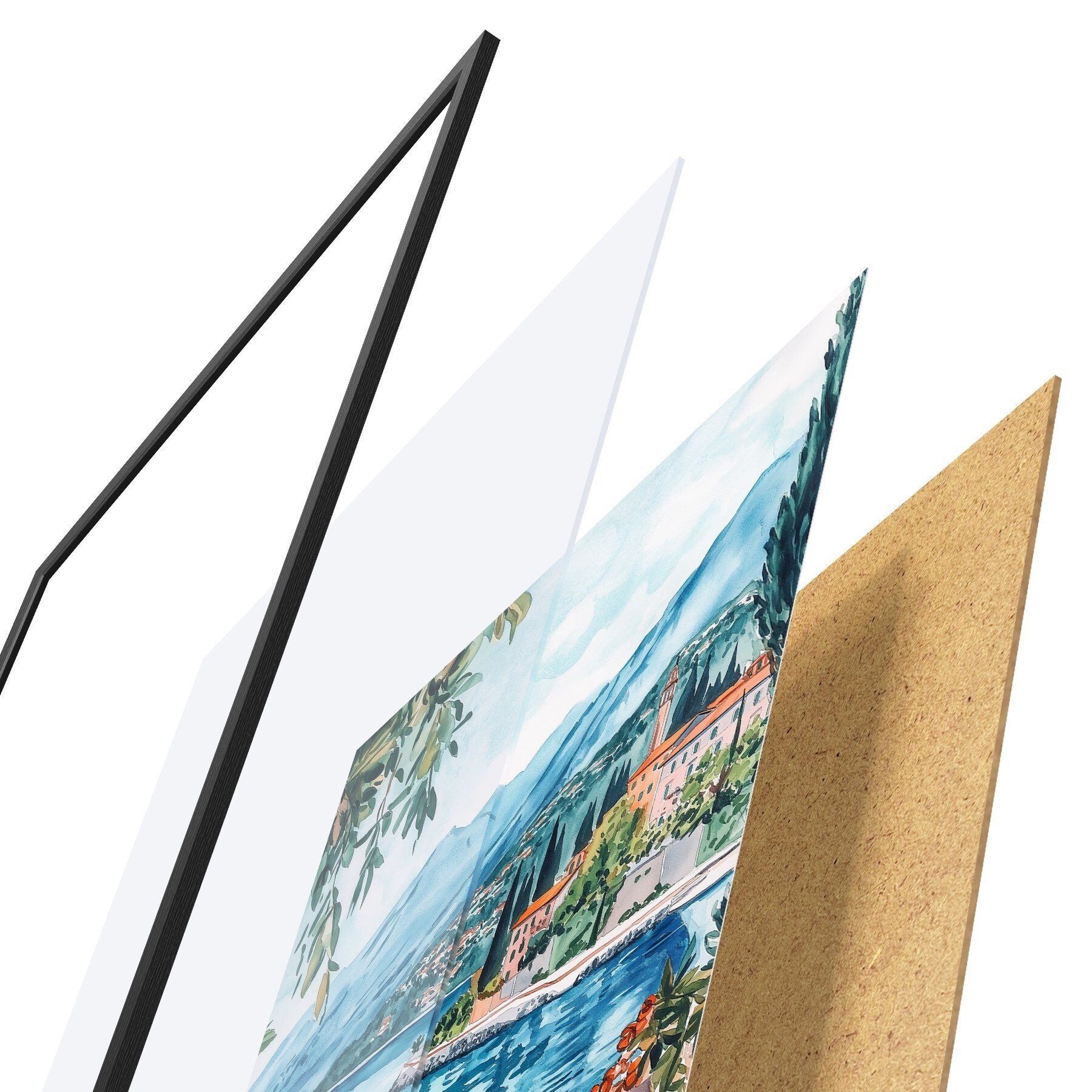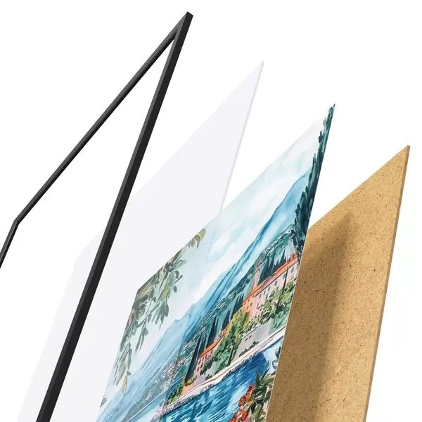 De poster bestaat uit een frame, plexiglas, geprinte afbeelding en spaanplaat achterkant. De poster kan meteen aan de muur worden gehangen dankzij de bevestigingen op de achterkant.