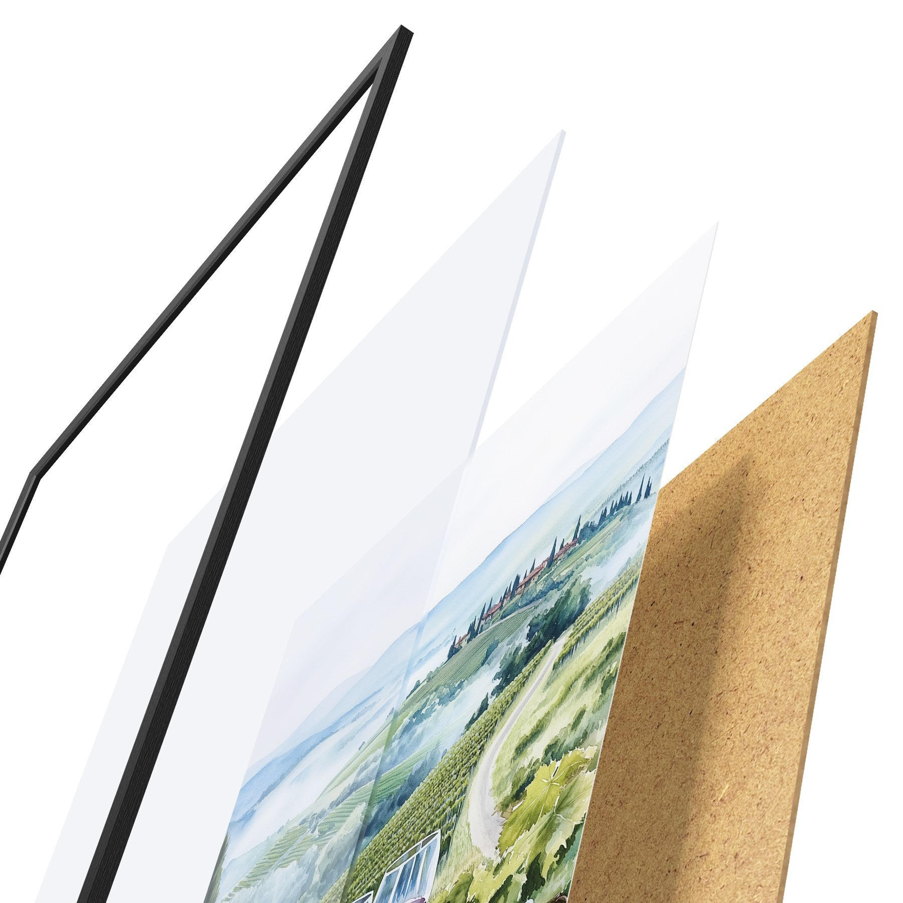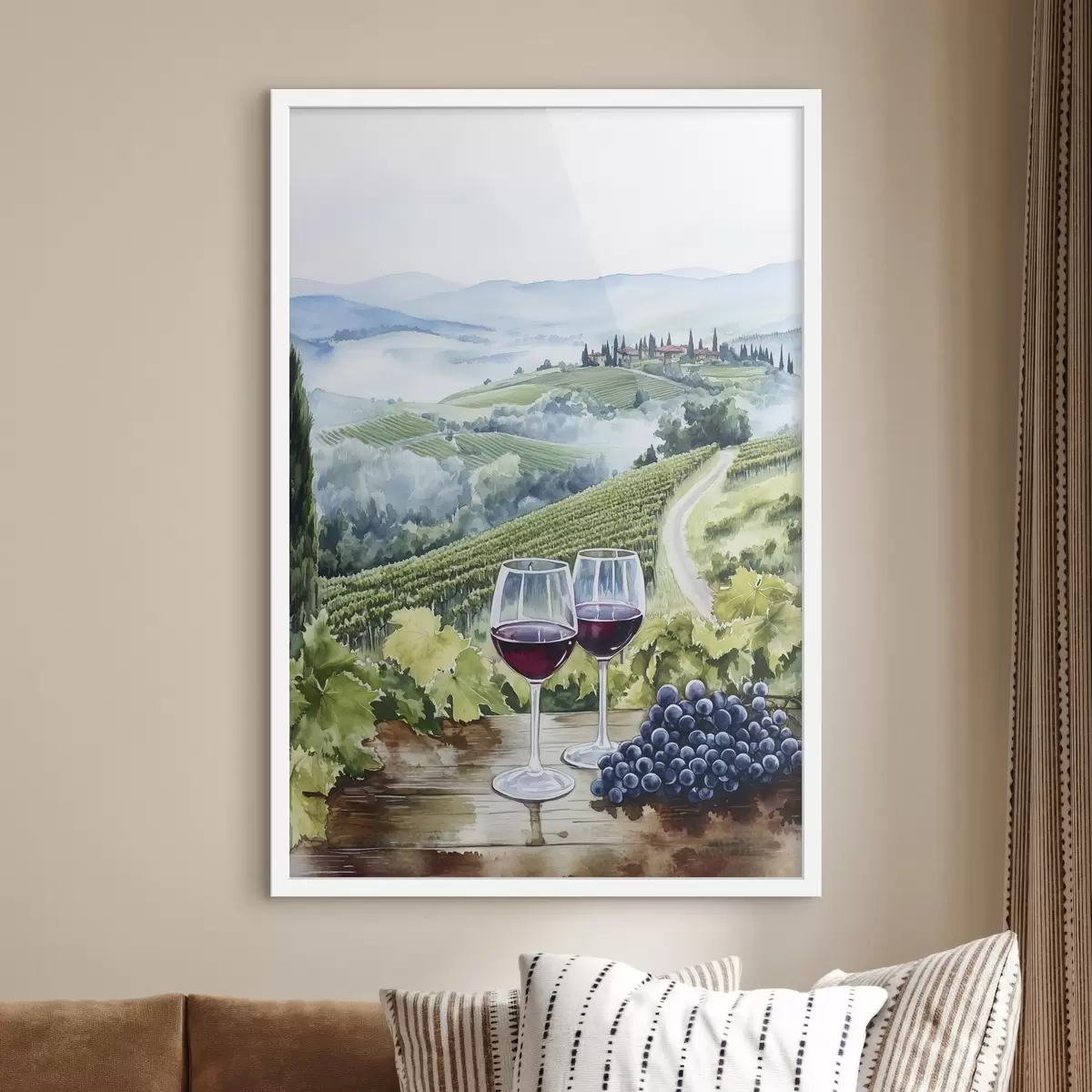 Poster Toscane landschap, wijngaarden, wijnglazen, aquarel stijl Nr f42445