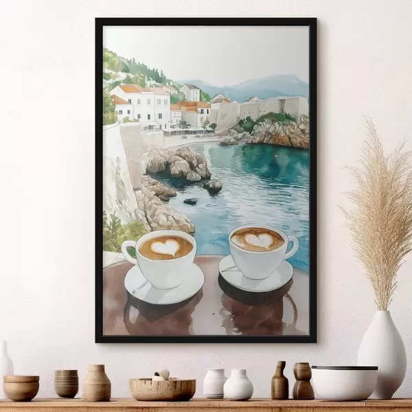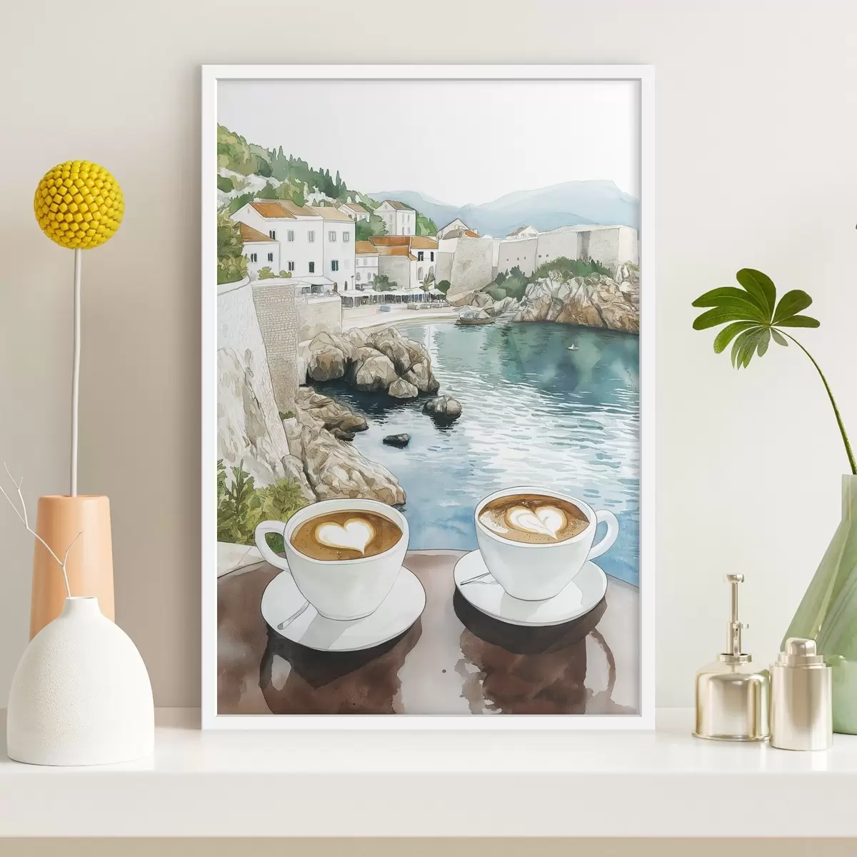 Poster Kopjes koffie aan zee, aquarelstijl, Kroatië Nr f42448