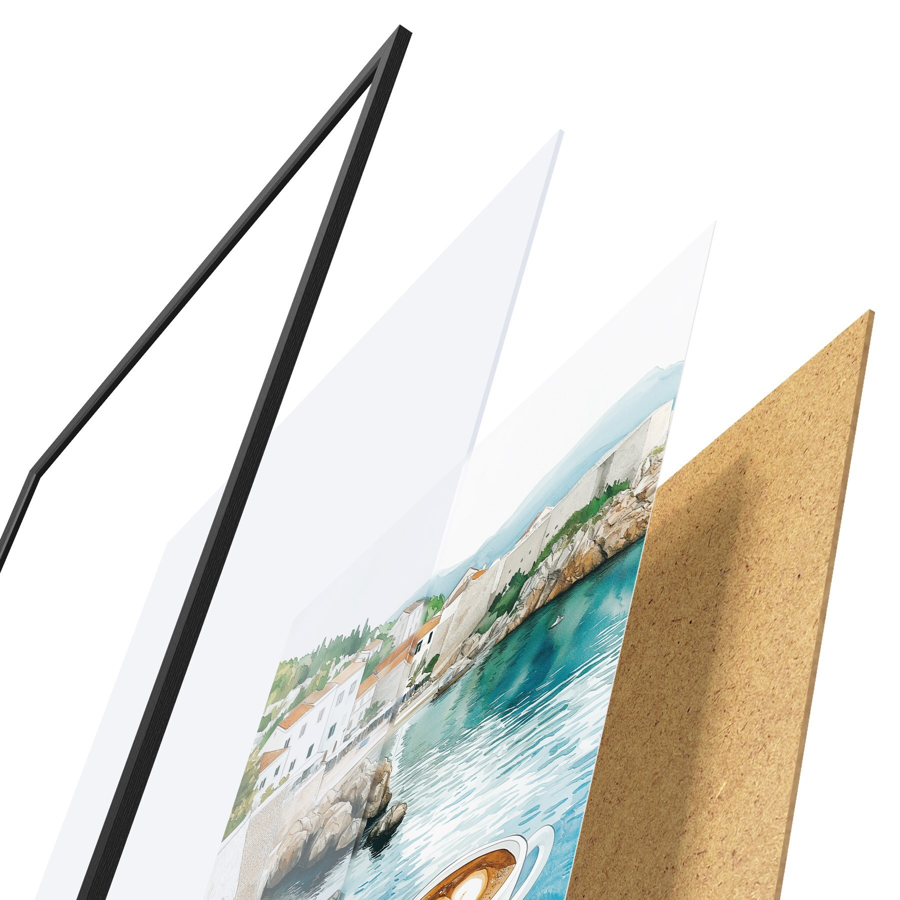 De poster bestaat uit een frame, plexiglas, geprinte afbeelding en spaanplaat achterkant. De poster kan meteen aan de muur worden gehangen dankzij de bevestigingen op de achterkant.