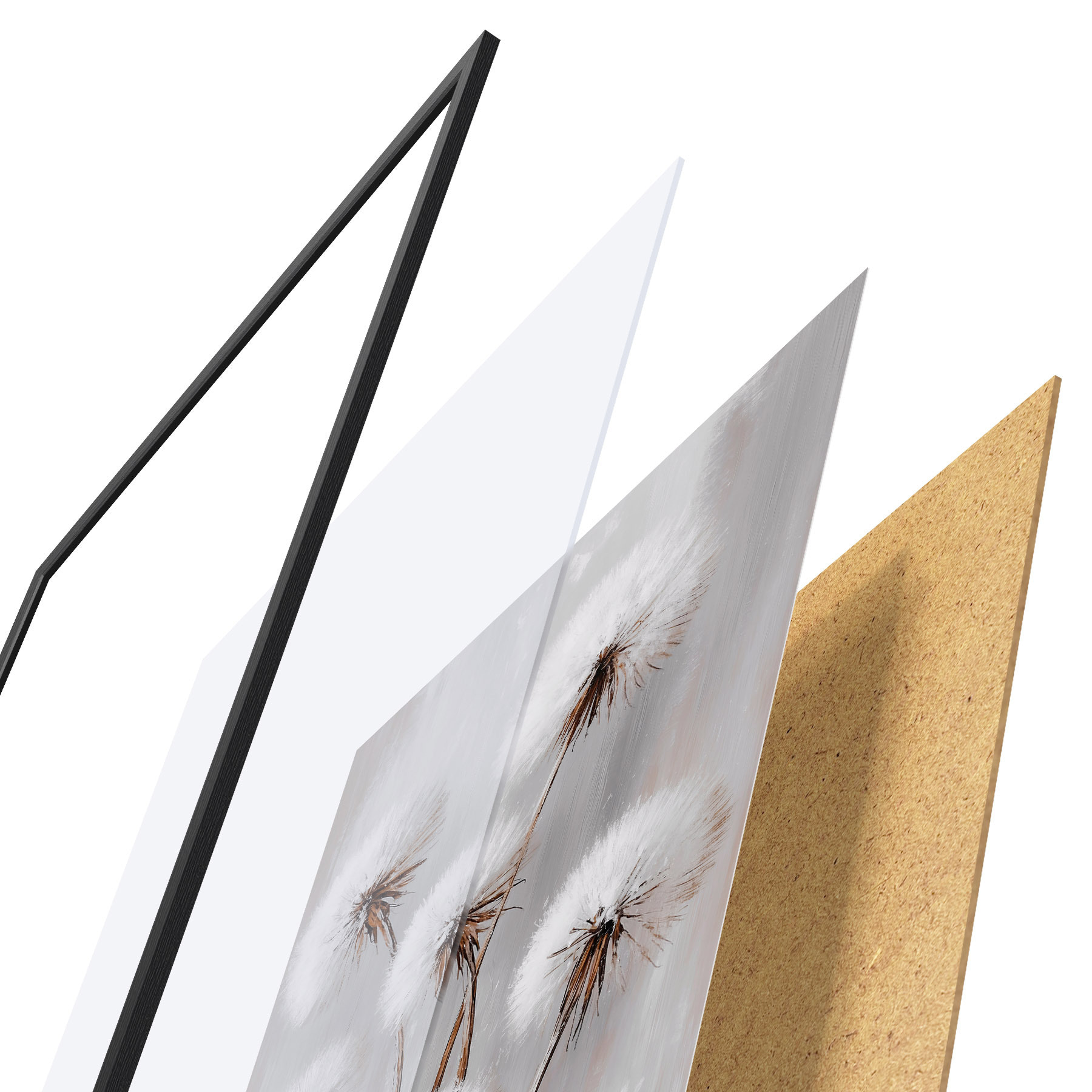 De poster bestaat uit een frame, plexiglas, geprinte afbeelding en spaanplaat achterkant. De poster kan meteen aan de muur worden gehangen dankzij de bevestigingen op de achterkant.