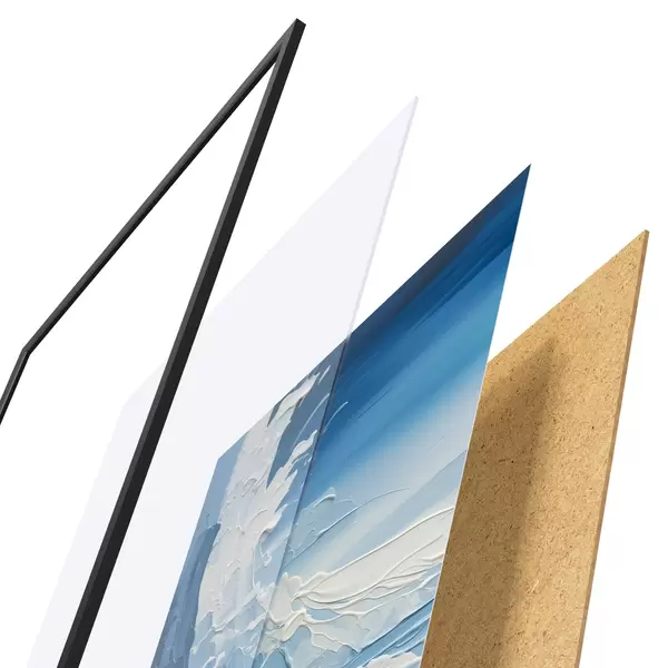 De poster bestaat uit een frame, plexiglas, geprinte afbeelding en spaanplaat achterkant. De poster kan meteen aan de muur worden gehangen dankzij de bevestigingen op de achterkant.