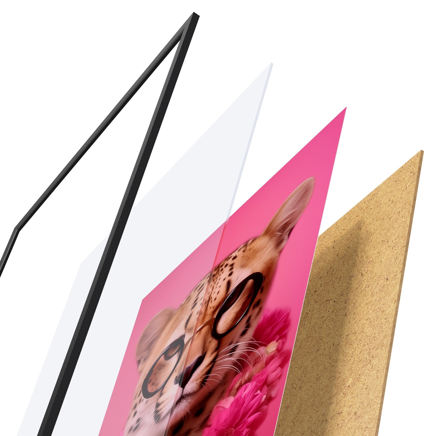 De poster bestaat uit een frame, plexiglas, geprinte afbeelding en spaanplaat achterkant. De poster kan meteen aan de muur worden gehangen dankzij de bevestigingen op de achterkant.