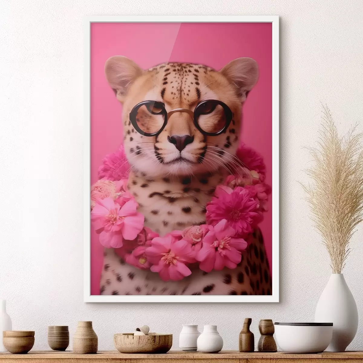 Poster Cheetah in bril met bloemenslinger f42477