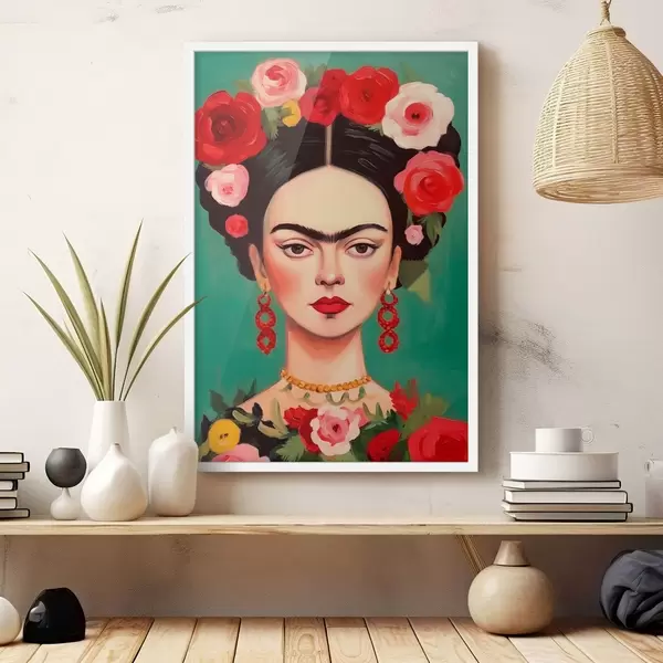 Poster Portret van Frida met een bloemenkrans op een groene achtergrond f42485
