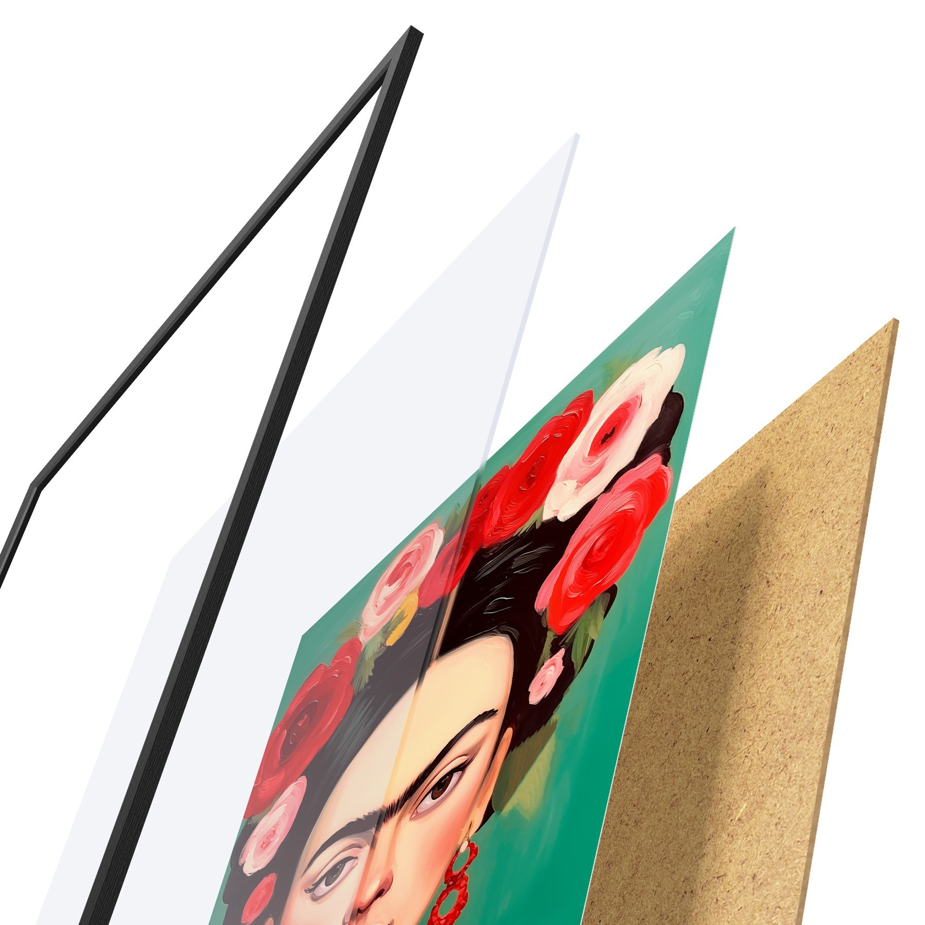 De poster bestaat uit een frame, plexiglas, geprinte afbeelding en spaanplaat achterkant. De poster kan meteen aan de muur worden gehangen dankzij de bevestigingen op de achterkant.