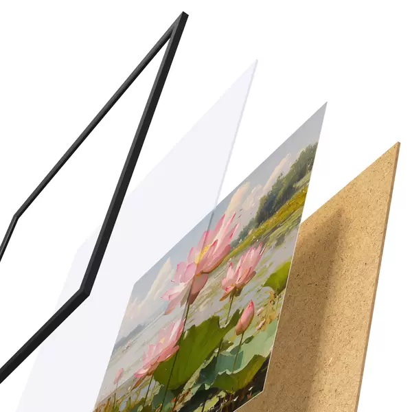 De poster bestaat uit een frame, plexiglas, geprinte afbeelding en spaanplaat achterkant. De poster kan meteen aan de muur worden gehangen dankzij de bevestigingen op de achterkant.