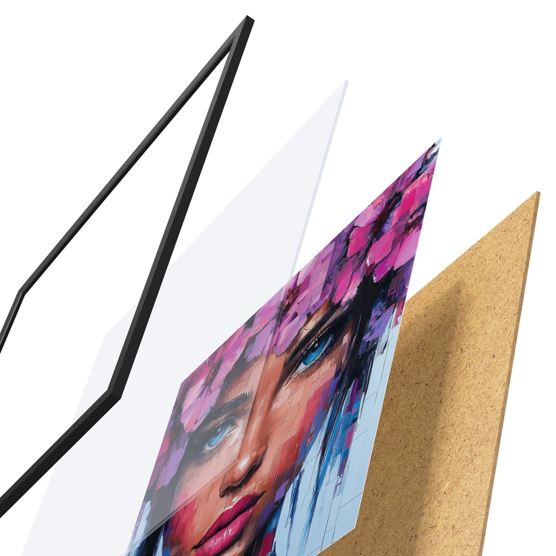 De poster bestaat uit een frame, plexiglas, geprinte afbeelding en spaanplaat achterkant. De poster kan meteen aan de muur worden gehangen dankzij de bevestigingen op de achterkant.