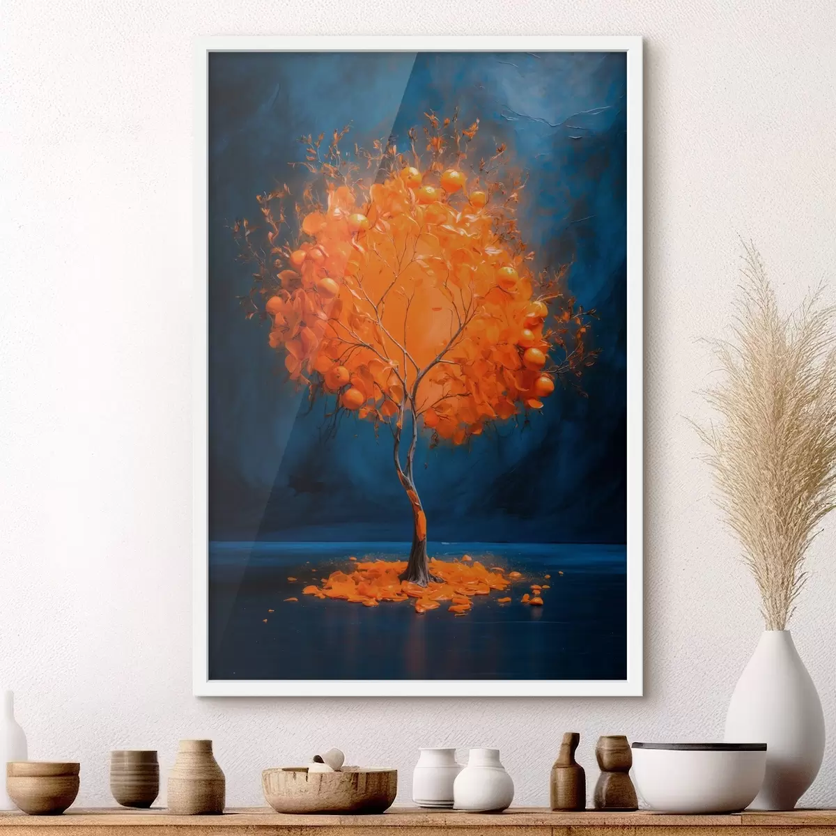 Poster Oranje boom op blauwe achtergrond in acrylschilderstijl Nr f42525