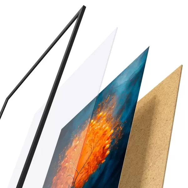 De poster bestaat uit een frame, plexiglas, geprinte afbeelding en spaanplaat achterkant. De poster kan meteen aan de muur worden gehangen dankzij de bevestigingen op de achterkant.