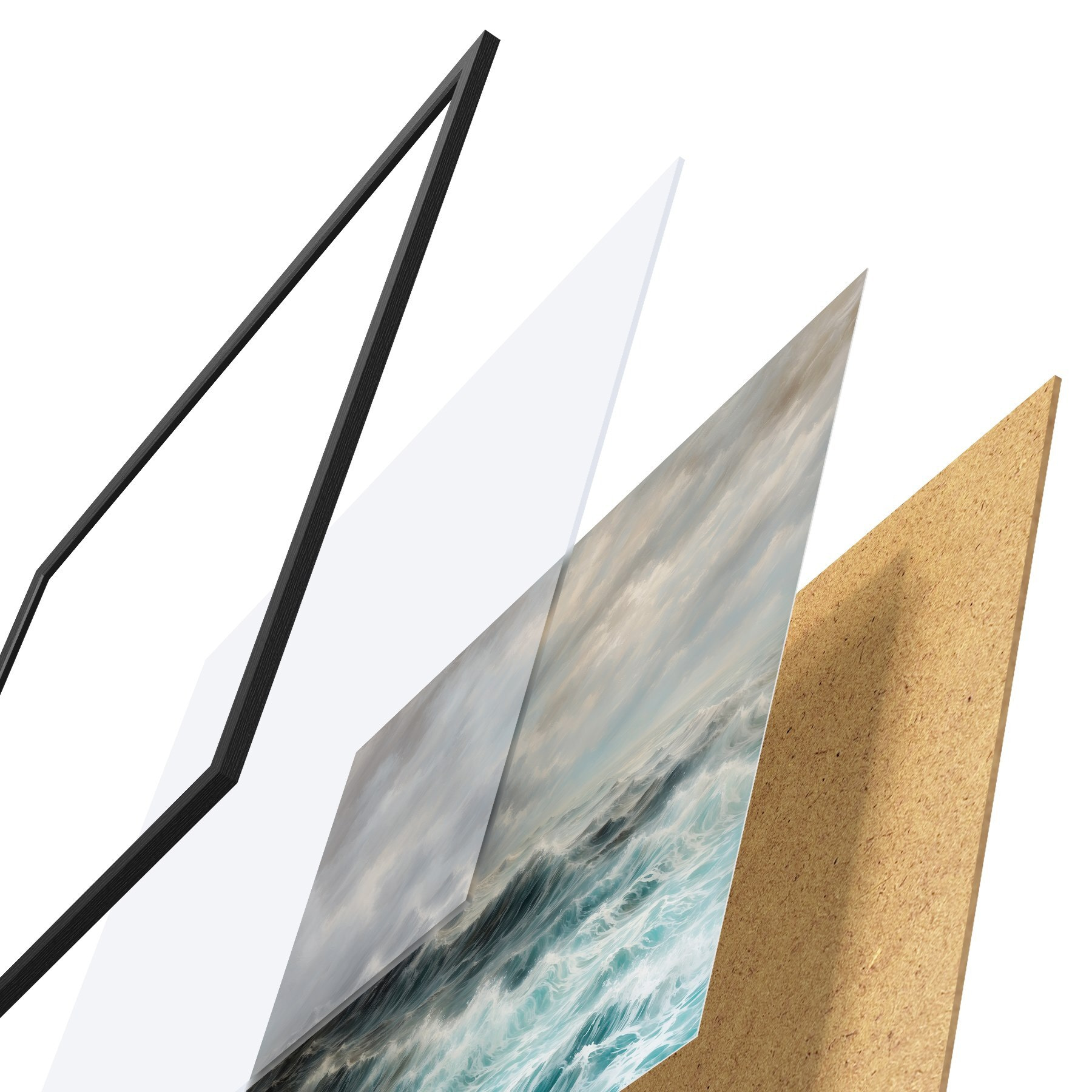 De poster bestaat uit een frame, plexiglas, geprinte afbeelding en spaanplaat achterkant. De poster kan meteen aan de muur worden gehangen dankzij de bevestigingen op de achterkant.