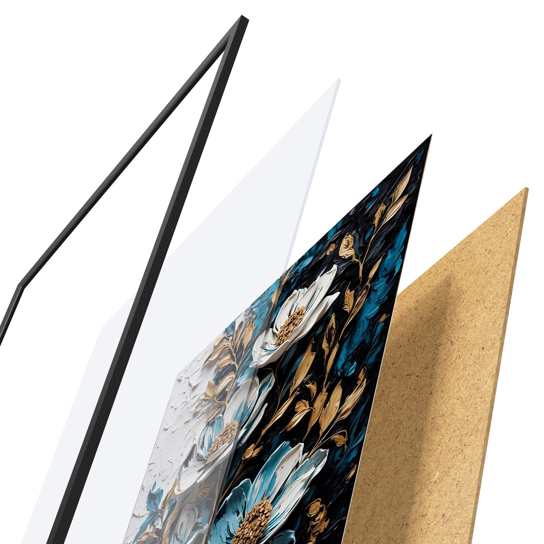 De poster bestaat uit een frame, plexiglas, geprinte afbeelding en spaanplaat achterkant. De poster kan meteen aan de muur worden gehangen dankzij de bevestigingen op de achterkant.