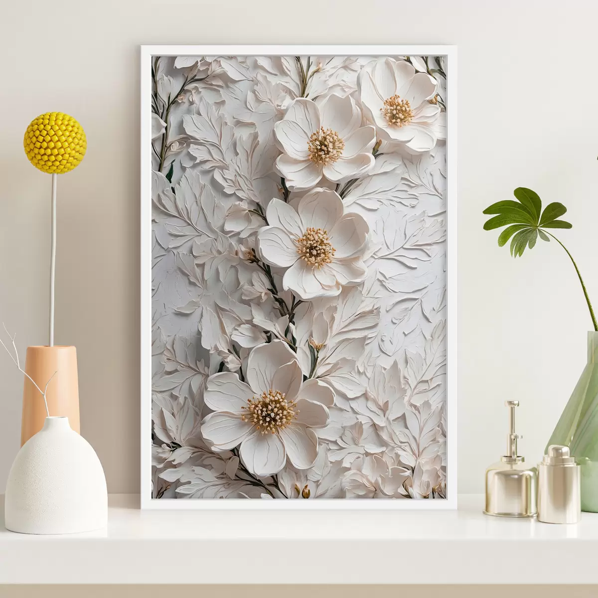 Poster Witte bloemen en stengels in olieverfstijl f42546