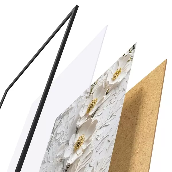 De poster bestaat uit een frame, plexiglas, geprinte afbeelding en spaanplaat achterkant. De poster kan meteen aan de muur worden gehangen dankzij de bevestigingen op de achterkant.