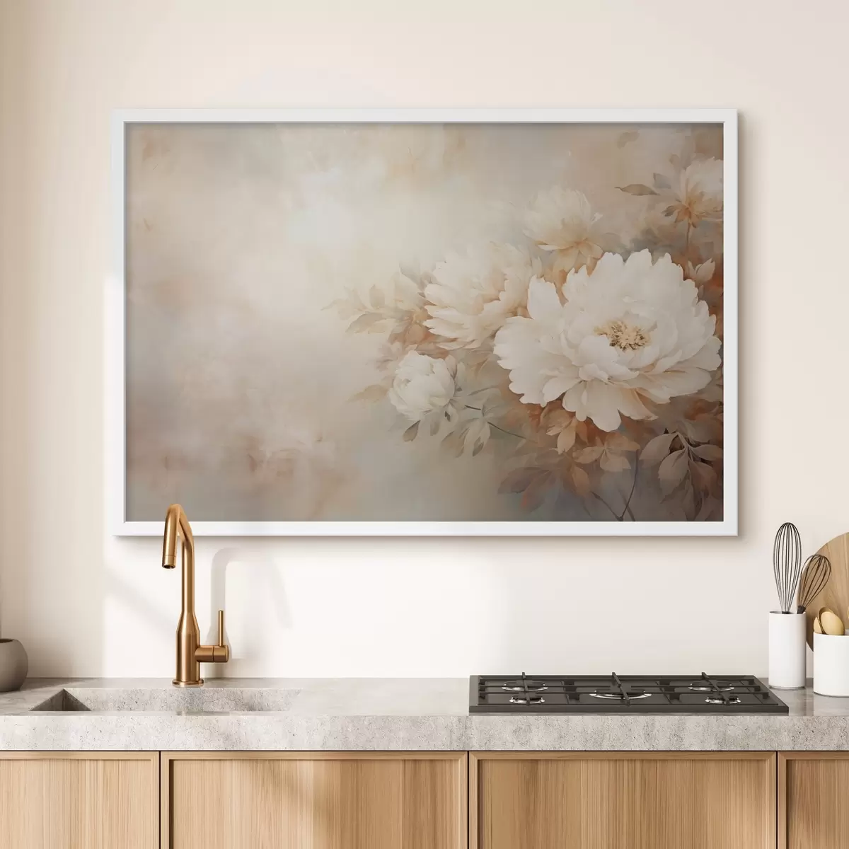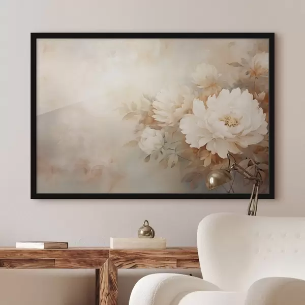 Poster Delicate pioenrozen in pastelkleurige crèmetinten op een onscherpe achtergrond, die een zachte en romantische sfeer creëert. Nr f42558