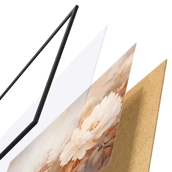 De poster bestaat uit een frame, plexiglas, geprinte afbeelding en spaanplaat achterkant. De poster kan meteen aan de muur worden gehangen dankzij de bevestigingen op de achterkant.