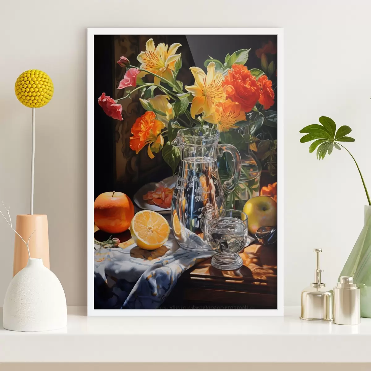 Poster Een stilleven met een boeket heldere bloemen in gele en rode tinten, een glazen kan, citrusvruchten en appels op een verlichte tafel. f42560