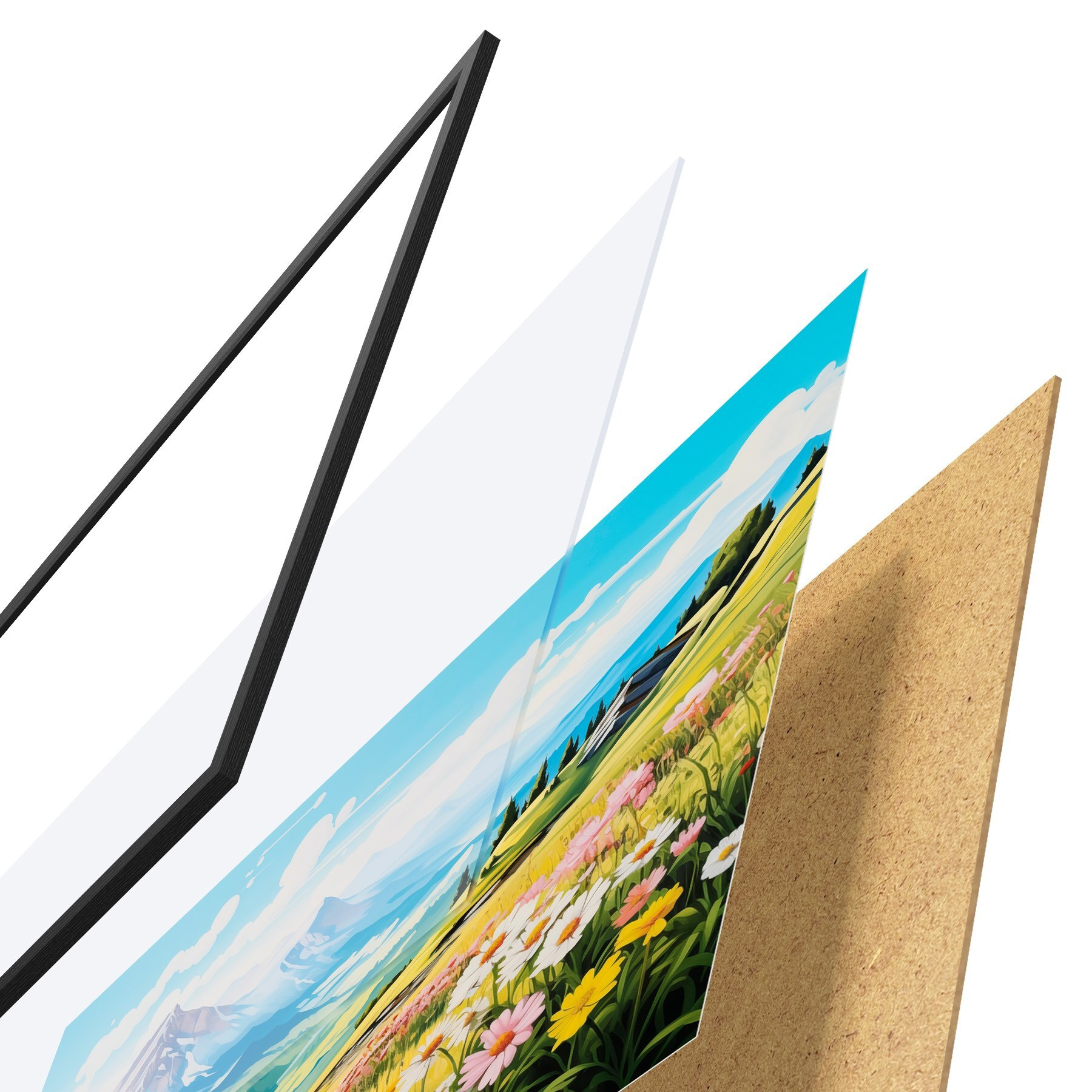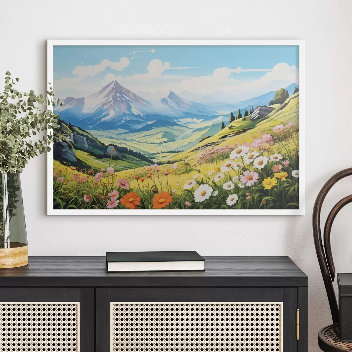 Poster Een levendig berglandschap met bloeiende weiden, groene heuvels en majestueuze bergtoppen onder een helderblauwe hemel. Nr f42565