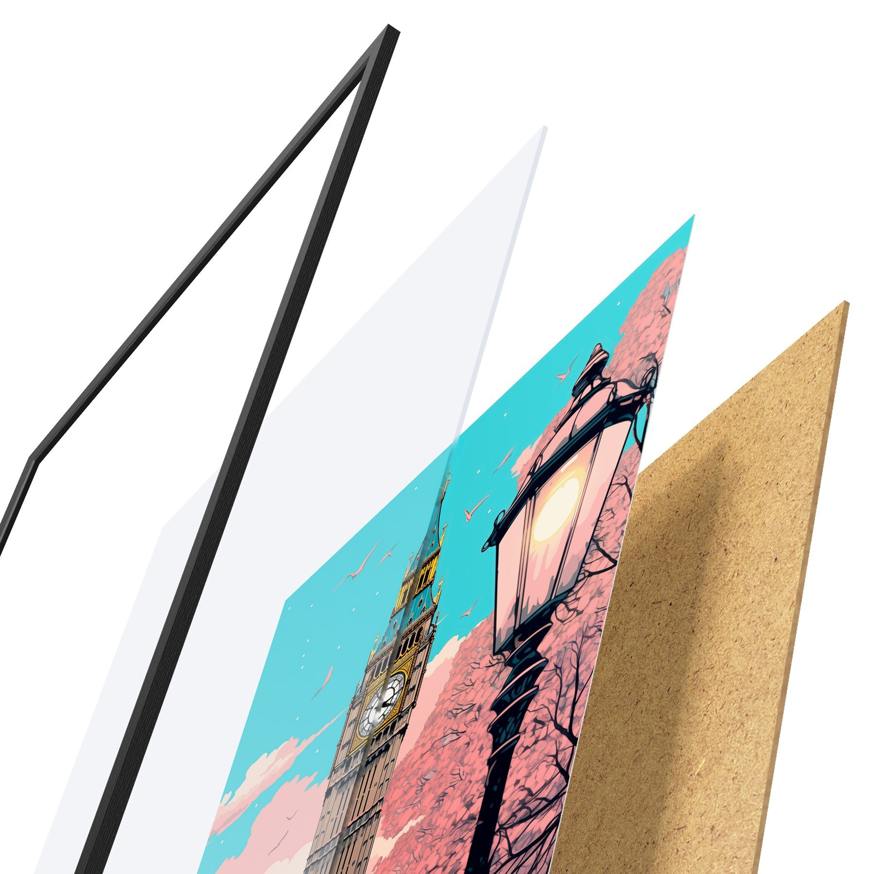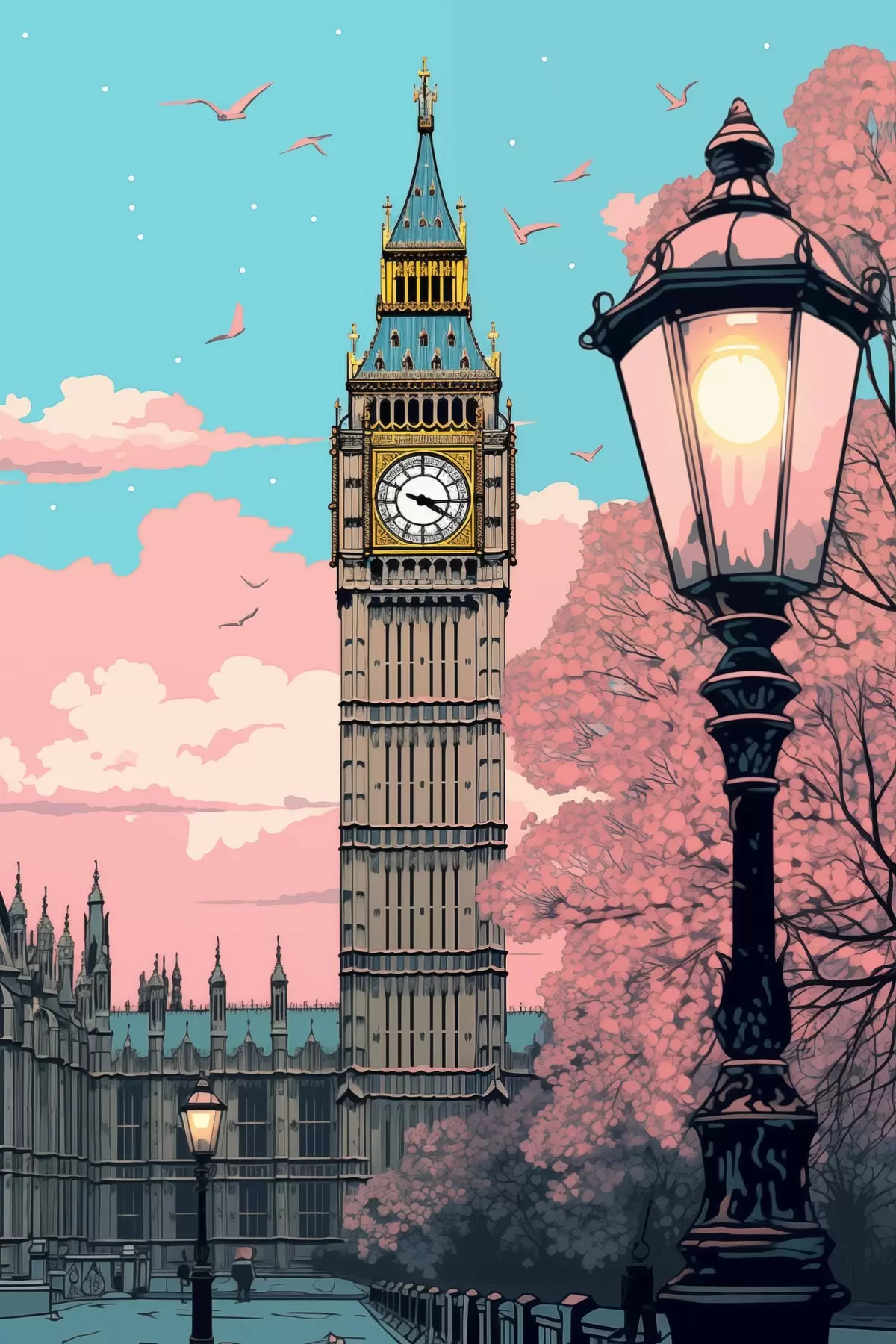 Poster Een blik op de Big Ben met lenteroze bomen, een helderblauwe lucht en een vintage straatlantaarn op de voorgrond. Nr f42578