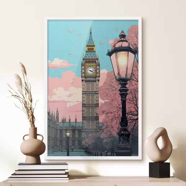 Poster Een blik op de Big Ben met lenteroze bomen, een helderblauwe lucht en een vintage straatlantaarn op de voorgrond. f42578
